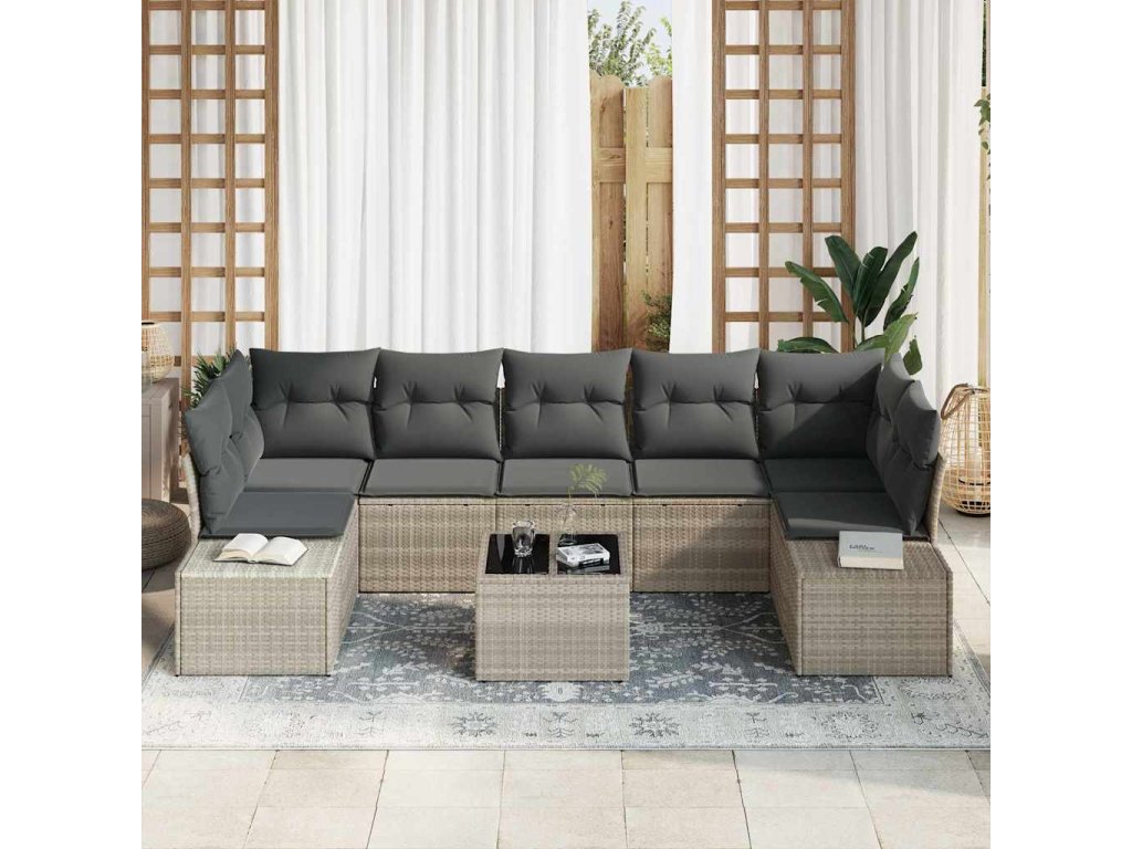 Tato zahradní pohovková sada spojuje styl a pohodlí, skvělá pro venkovní shromáždění nebo relax na verandě. Její trendy barvy světle šedé a taupe ji dělají univerzální volbou pro až sedm lidí – perfektní pro rodinné a přátelské chvíle. Elegantní tvary a velkorysé rozměry přinášejí příjemnou atmosféru, zatímco odolné materiály udržují vypadat skvěle celoročně. Ať už si užíváš sluneční brunch, nebo si pořádáš útulnou noc, tahle zahradní pohovka se bude parádně vyjímat.