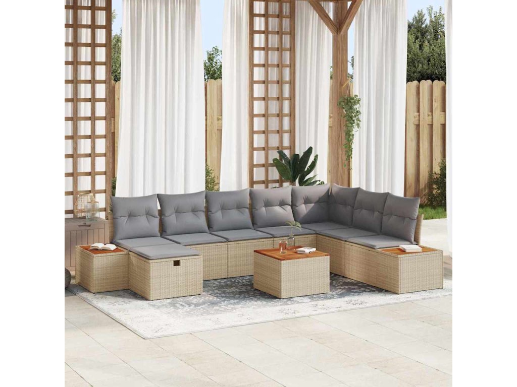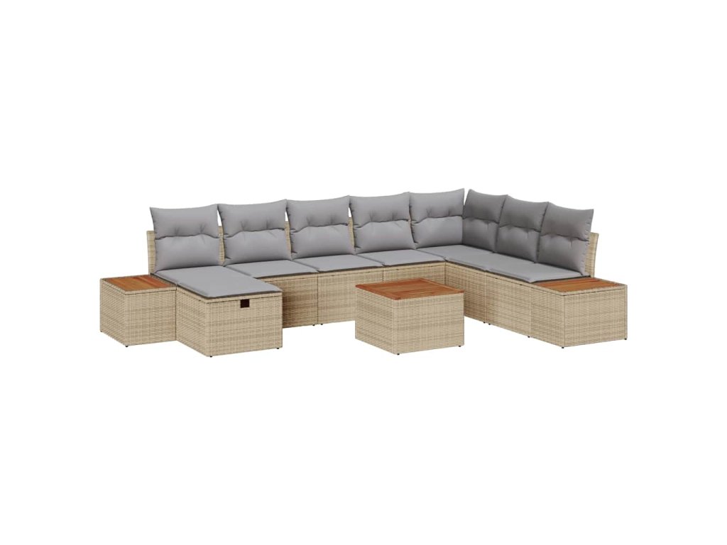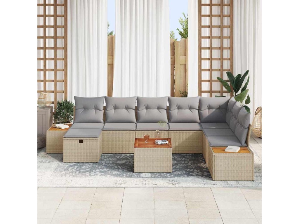 Tato venkovní rohová pohovka dodává styl tvému zahradnímu nábytku. Skládá se z devíti modulárních kousků, včetně pohovkových sekcí, podnožek a zahradního stolu. Tato sestava promění jakýkoli venkovní prostor na pohodlné místo pro tebe a tvoje přátele, kde si můžete odpočinout a užít si hezké počasí.