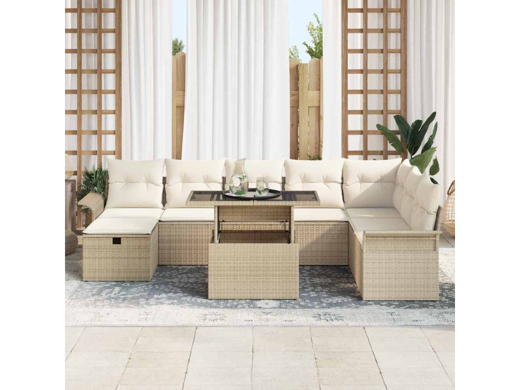 Tato 9dílná zahradní sedačka je fakt super pro každou venkovní plochu a poskytuje pohodlné místo pro trávení času s až 8 přáteli. Elegantní béžový poly ratan se měkkými krémovými polstry vytváří příjemnou atmosféru, ideální pro rodinné zábavy nebo lenošení na slunci ve vaší zahradě či na balkóně.