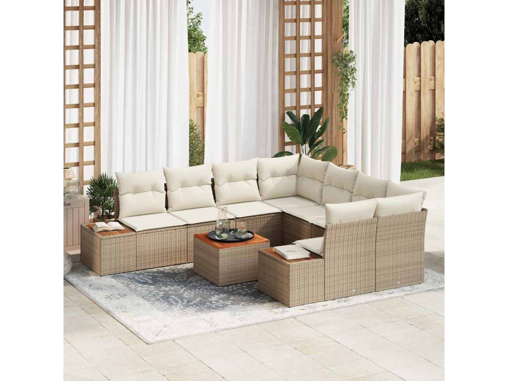 Tento zahradní pohovkový set je dokonalým doplňkem každého venkovního prostoru, navržený s elegancí a funkčností na mysli. Jeho moderní styl, charakterizovaný čistými linkami a minimalistickou estetikou, bezproblémově zapadne do zahrad a teras, nabízející jak pohodlí, tak sofistikovanost. Povrch vyrobený z masivního akáciového dřeva a rám z poly ratanu poskytují klasický, ale odolný vzhled, který vybízí k relaxaci a společenským setkáním. Ideální pro venkovní stolování nebo neformální odpočinek, tento set zvyšuje jakékoli prostředí svým stylovým kouzlem a praktickými funkcemi.