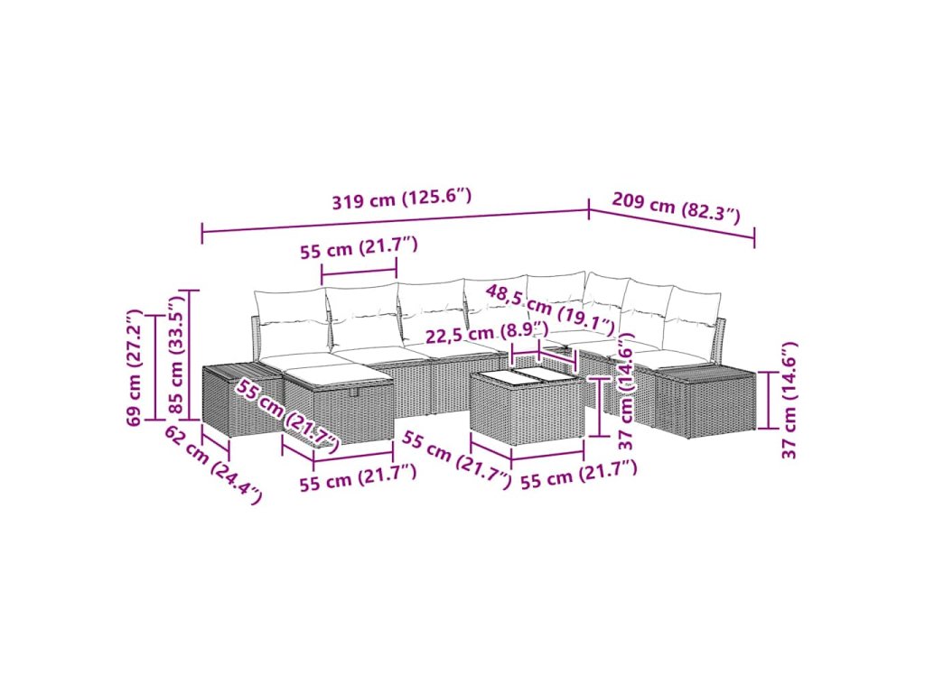 Podívej se na tuto 9dílnou sadu zahradní pohovky vidaXL - má stylový design, který míchá styl s praktičností, ideální pro zahradní párty nebo jen lenošení na slunečném dni. Vyrobena z odolného béžového poly ratanu a měkkých šedých polyesterových polštářů vytváří přívětivou atmosféru pro rodinu a přátele, spojující komfort a eleganci.