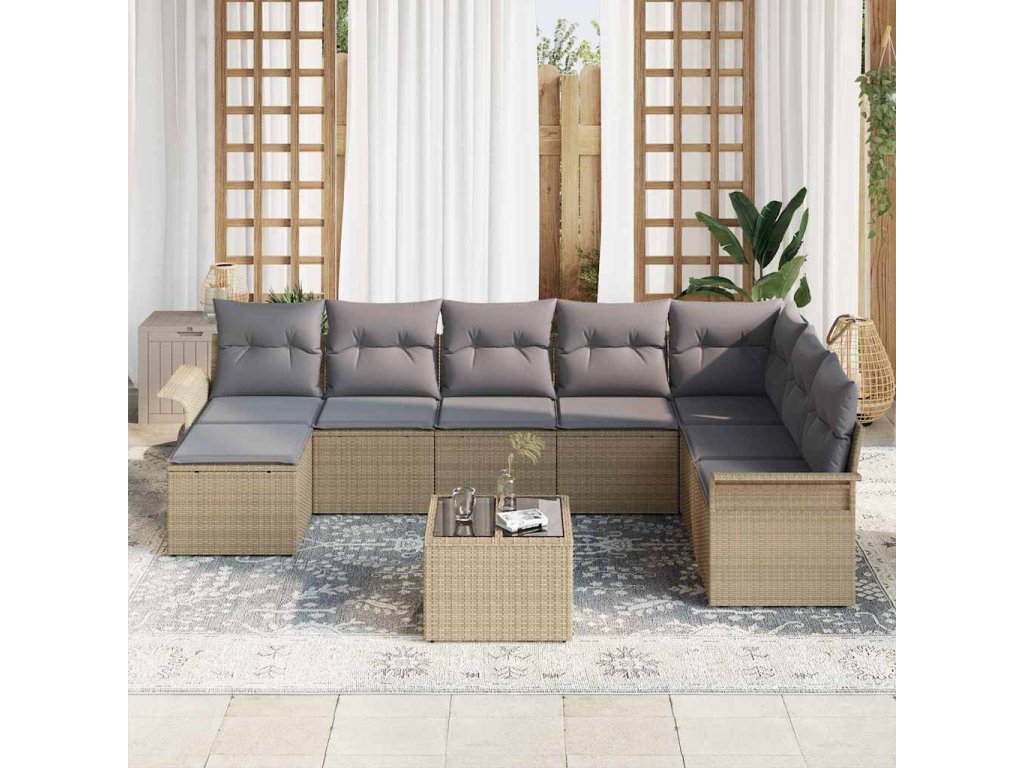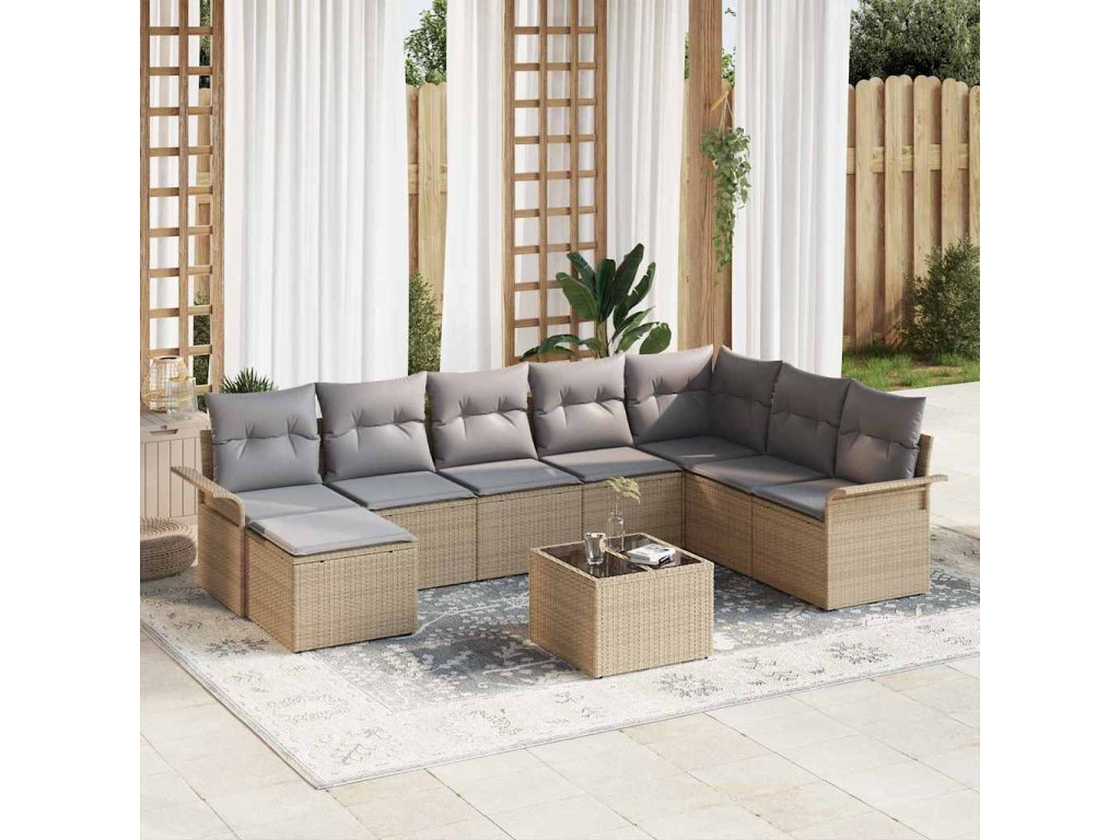 - Elegantní design: Moderní provedení dodá šmrnc jakémukoliv venkovnímu prostoru. Béžová ratanová tkanina s šedými polštáři vytváří příjemnou a stylovou atmosféru pro lenošení nebo zábavu.
