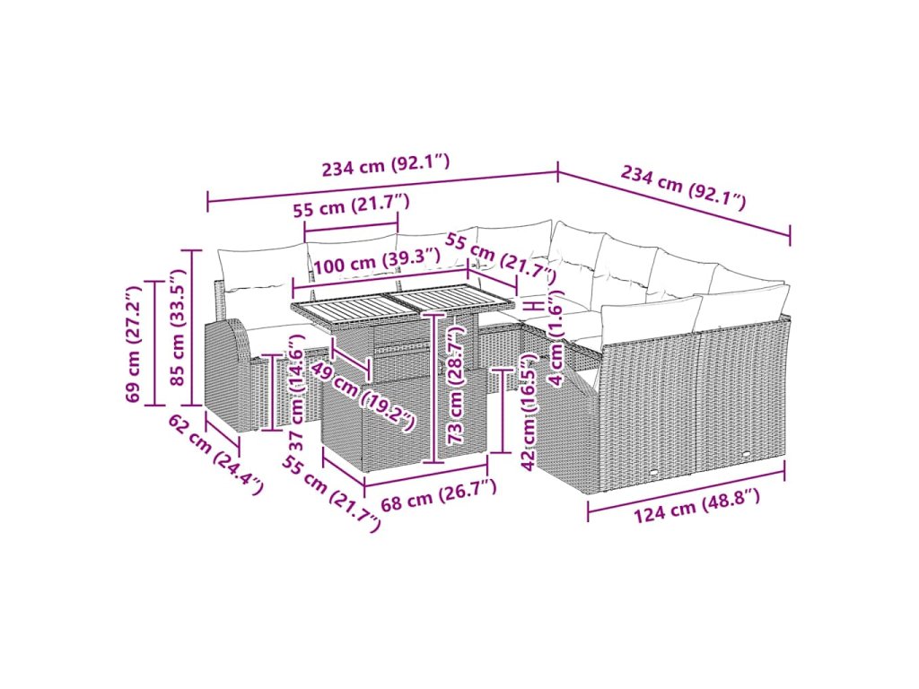 - Dodávka obsahuje: 2 x Arm sofa s úložnou funkcí, 2 x Rohové sedadlo s úložnou funkcí, 4 x Střední sedadlo s úložnou funkcí, 1 x Zahradní stůl