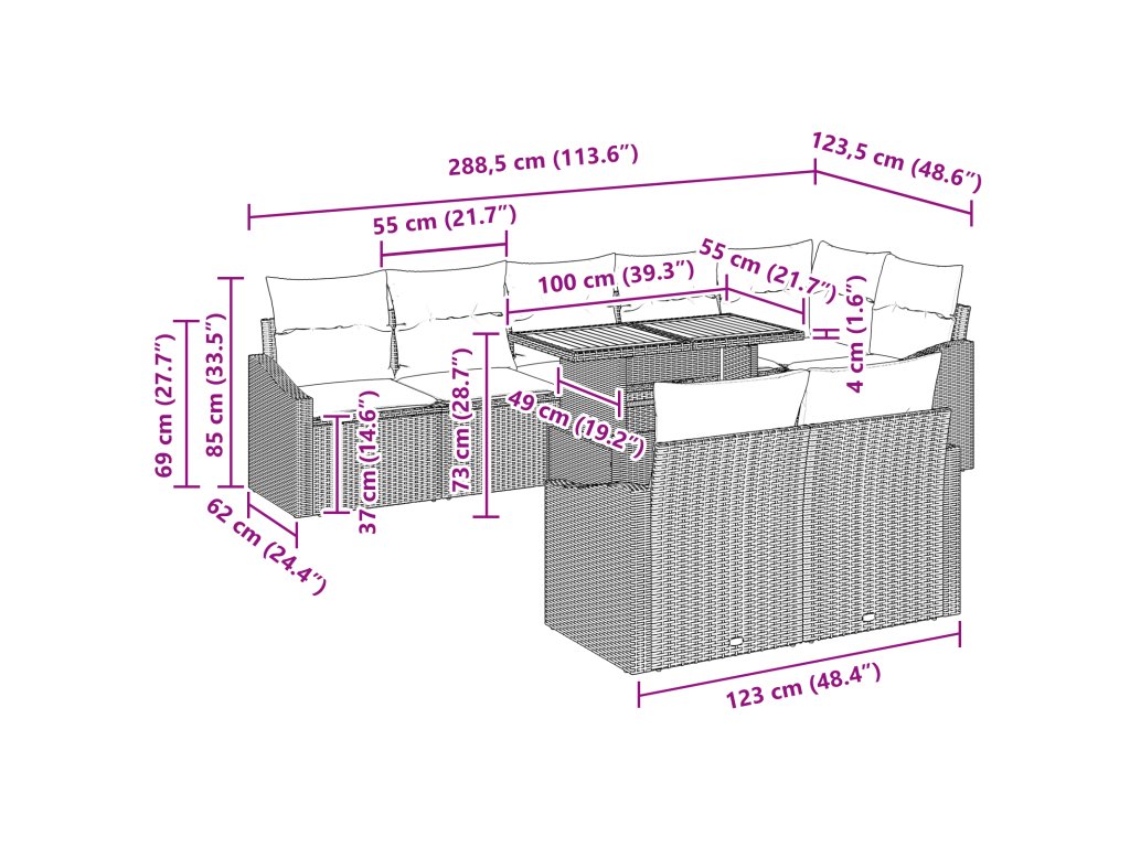 - Dodávka obsahuje: 4 x Arm pohovka včetně úložné funkce, 1 x Rohové sedadlo včetně úložné funkce, 3 x Středové sedadlo včetně úložné funkce, 1 x Zahradní stůl
