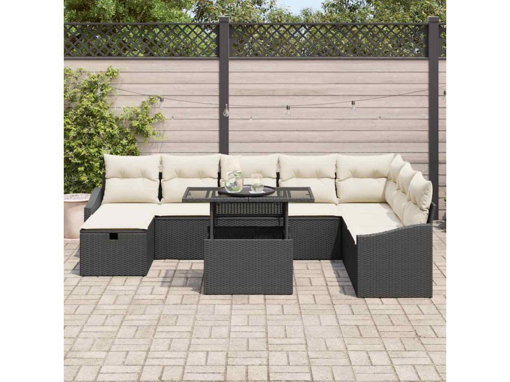 - Stylová estetika: Kombinace černého poly ratanu s krémovými polštáři dodává šmrnc a praktičnost venkovním prostorám.