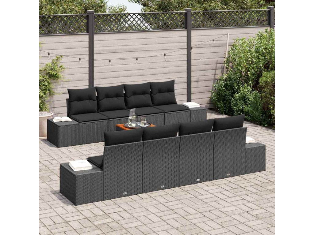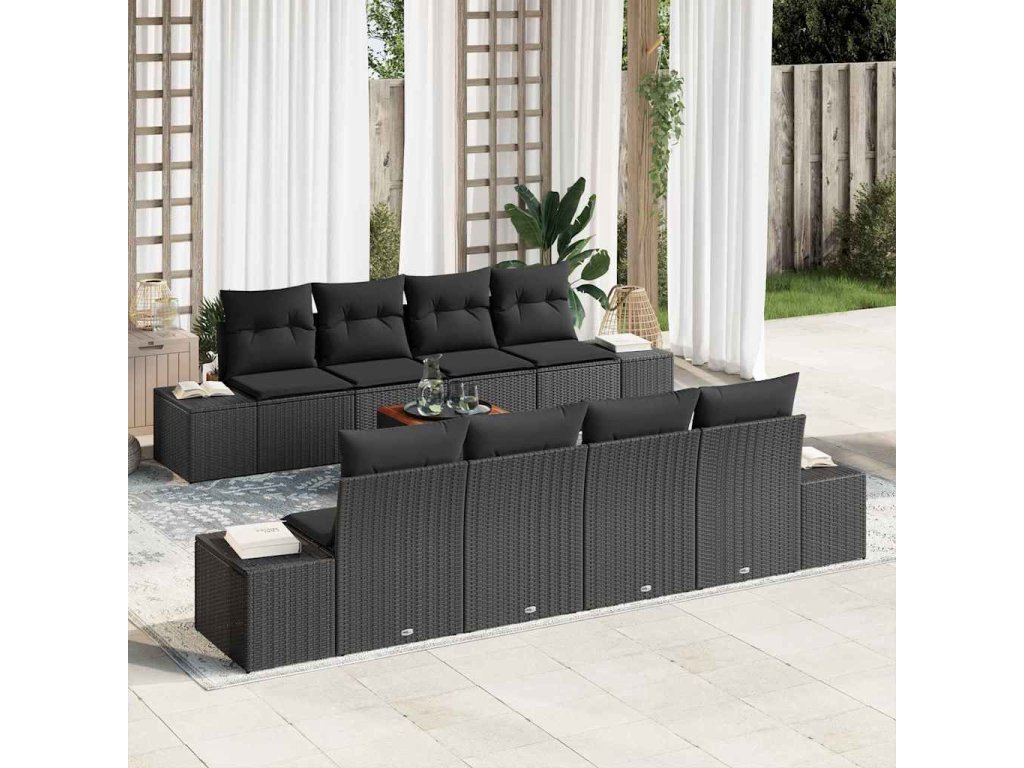 Tato 9dílná sada zahradní pohovky je udělaná z pevných poly ratanových materiálů s elegantním matným povrchem a pohodlnými černými polštáři. Je skvělá pro venkovní chillování, spojuje styl a pohodlí. Moderní design na čistých liniích vytváří super atmosféru pro odpočinek nebo zábavu.