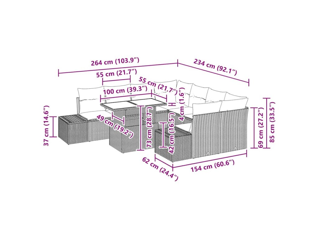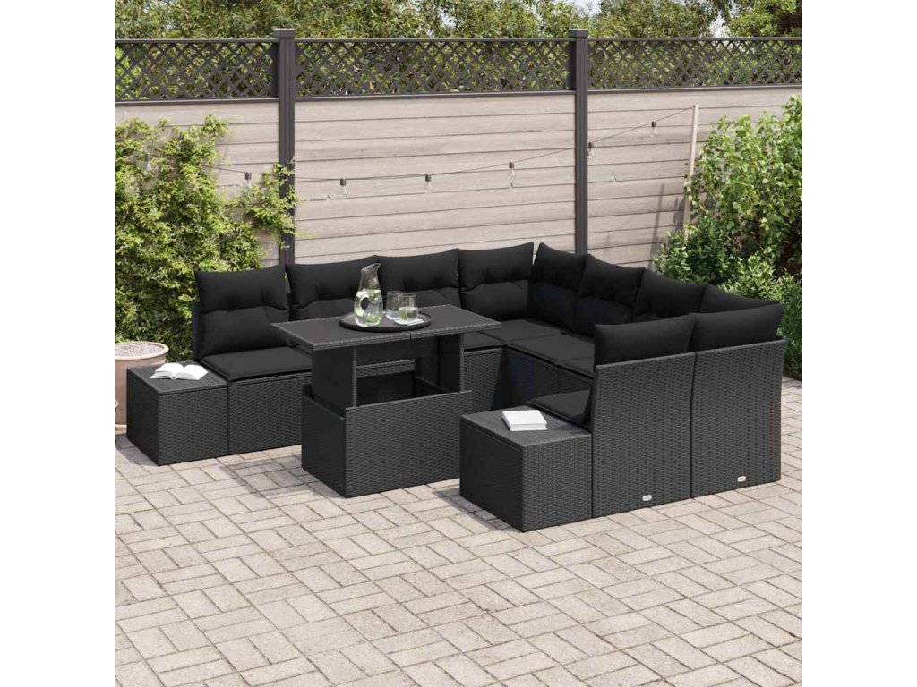 Tato devítidílná souprava zahradní pohovky dokáže udělat z jakéhokoli venkovního místa stylové posezení se svým elegantním designem a pohodlnými funkcemi. Vyrobená z odolného poly ratanu, spojuje vzhled s praktičností, což ji dělá skvělou volbou pro balkóny, terasy a zahrady. Ideální pro relaxaci za slunečných dní nebo teplých nocí.