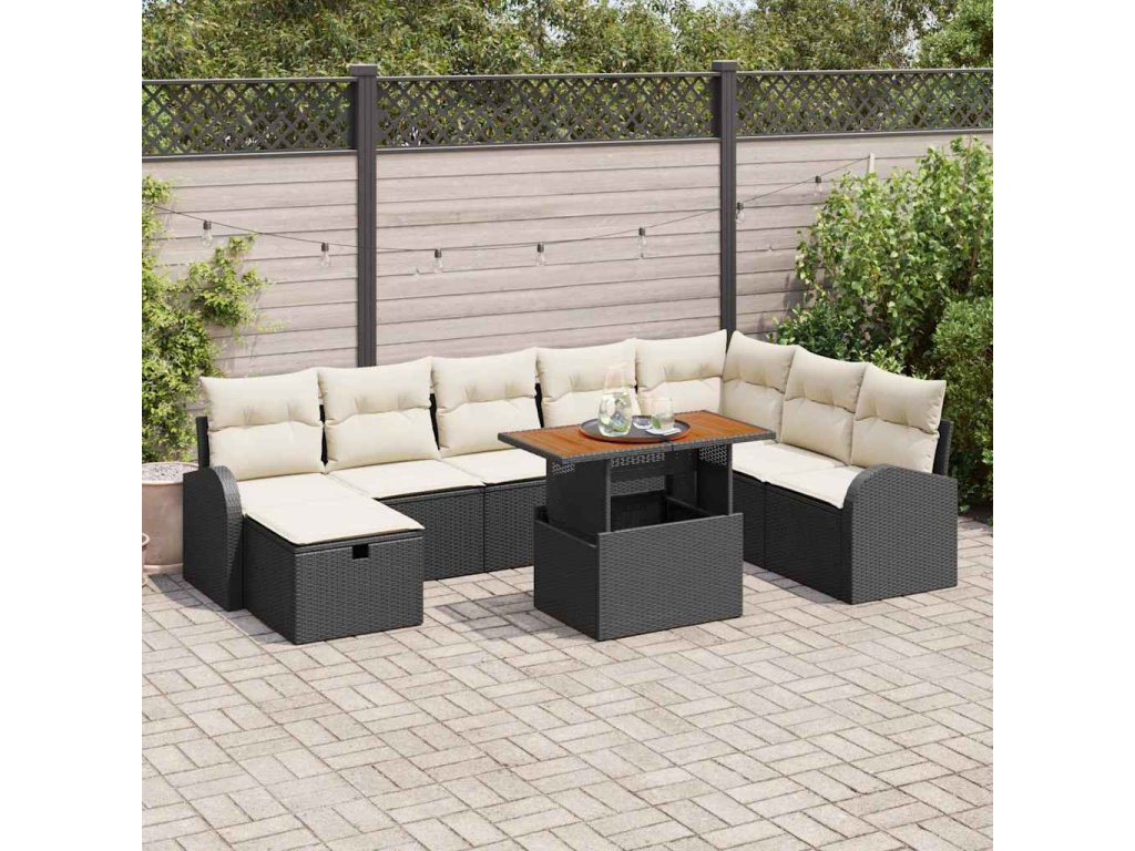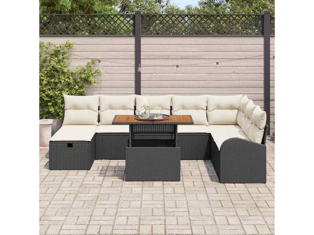 - Dodávka obsahuje: 4 x Střední sedadlo včetně funkce úložiště, 1 x Rohové sedadlo včetně funkce úložiště, 2 x Rukávové pohovky včetně funkce úložiště, 1 x podnožka s funkcí úložiště, 1 x Zahradní stůl