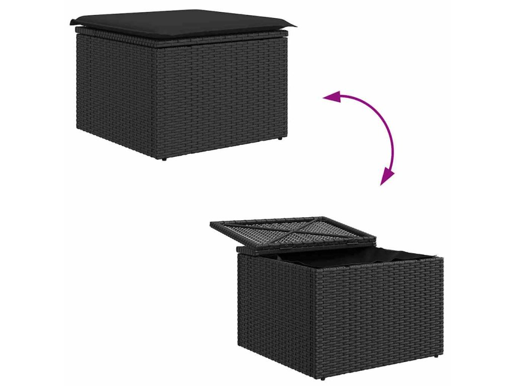 - 4 x středová sedadla včetně úložného prostoru, 1 x rohové sedadlo včetně úložného prostoru, 2 x křesla včetně úložného prostoru, 1 x taburet s úložným prostorem, 1 x zahradní stůl