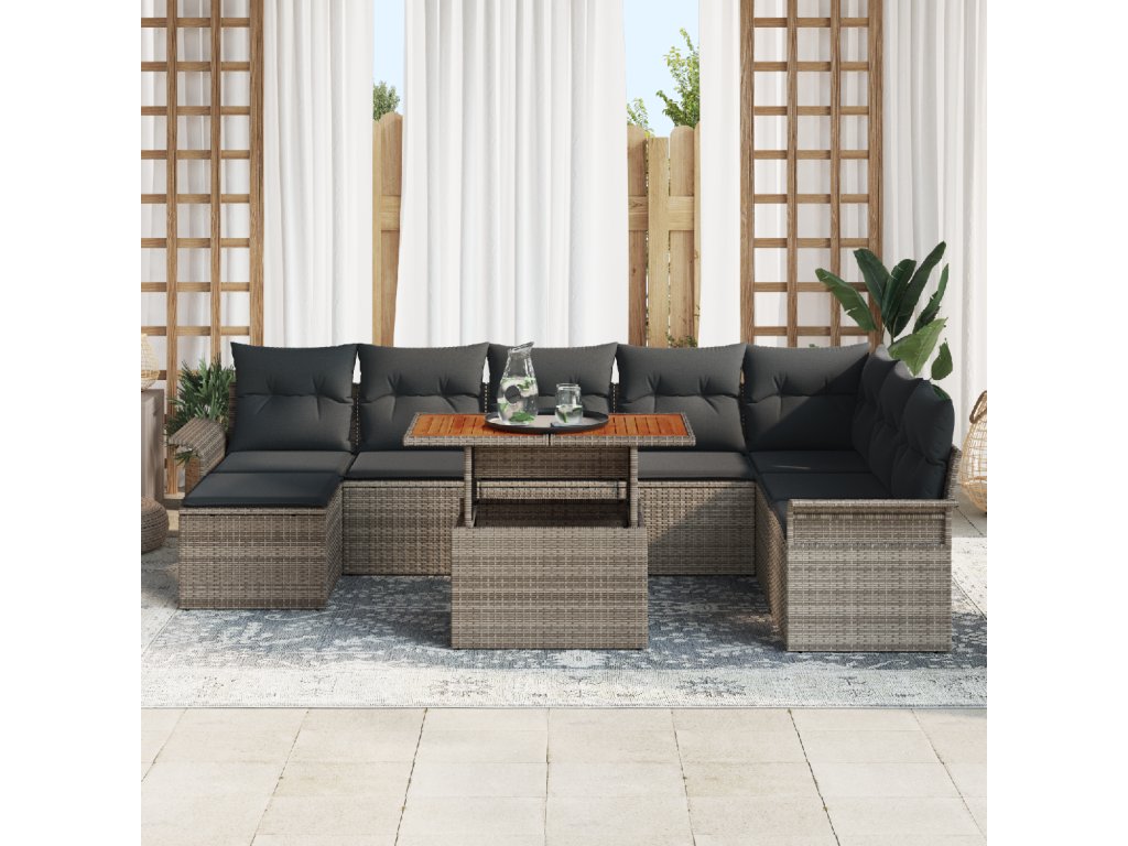 Tahle devítidílná zahradní jídelní souprava spojuje styl a funkčnost, a poskytuje spoustu místa pro setkání, rodinné BBQ nebo večery pod hvězdami. Její moderní design a neutrální barvy skvěle zapadnou do jakéhokoli venkovního prostoru, a navíc je komfortní a odolná.