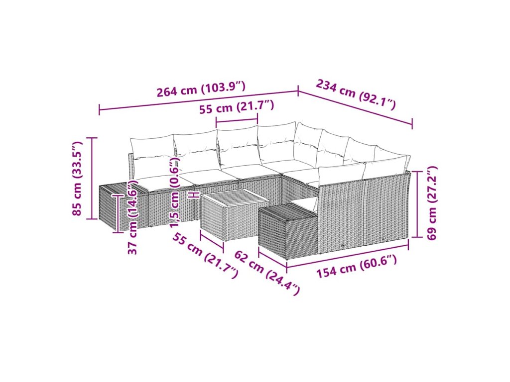 Tato 9-kusová zahradní pohovka je stylová a praktická, ideální pro venkovní setkání. Její moderní design určitě zaujme každou terasu nebo zahradu, a pozve kamarády a rodinu k pohodlnému odpočinku.