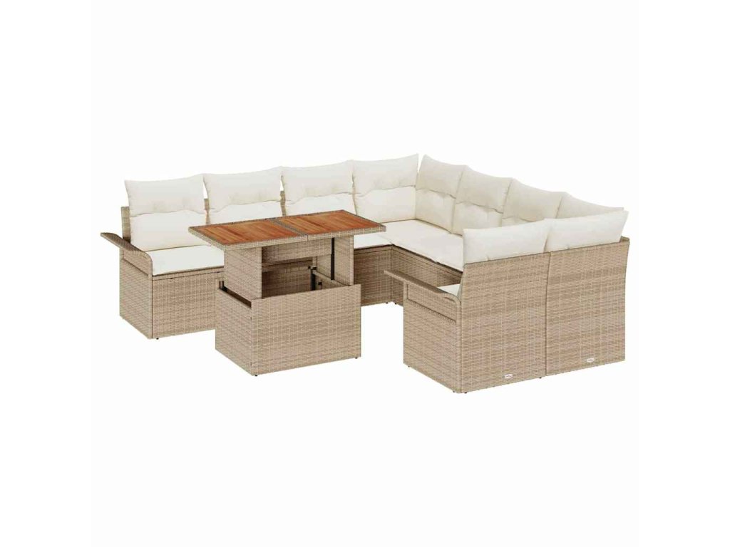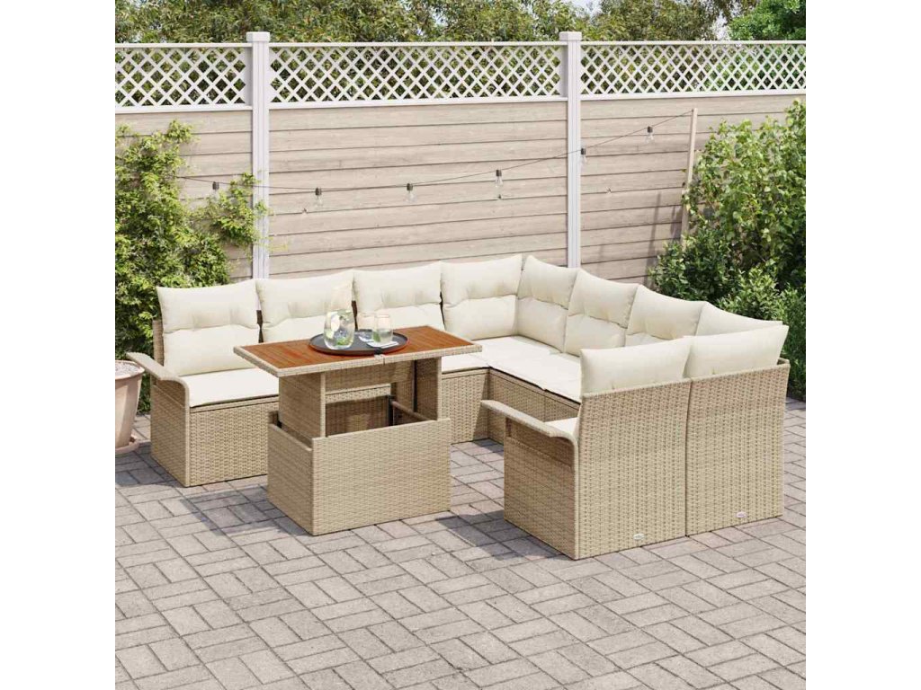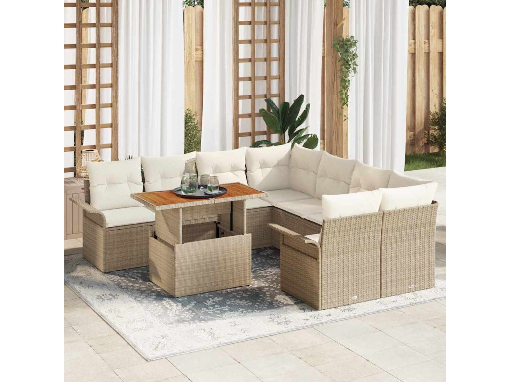 Tahle úžasná devítidílná zahradní souprava na pohovku spojuje styl a pohodlí, takže je ideální do každého venkovního prostoru. Má robustní rám z přírodního ratanu v příjemné béžové barvě a je doplněna měkkými polyesterovými polštáři – ideální pro relaxaci, ať už pořádáš posezení s přáteli nebo si užíváš klidný čas na terase.
