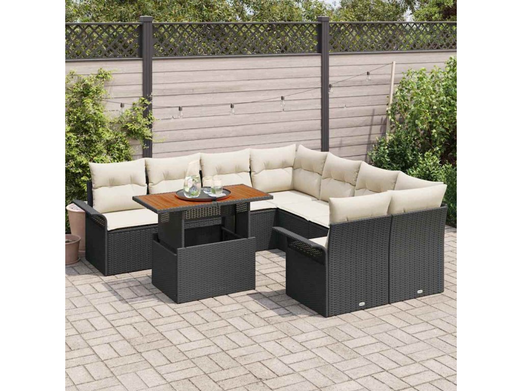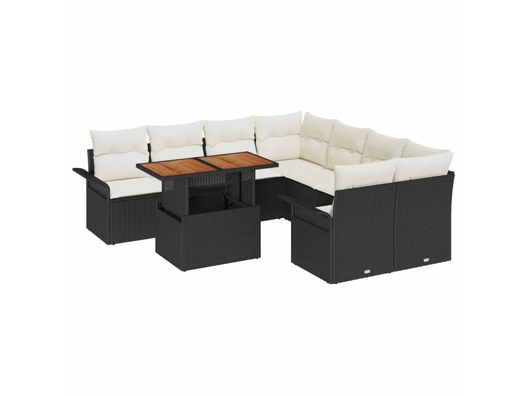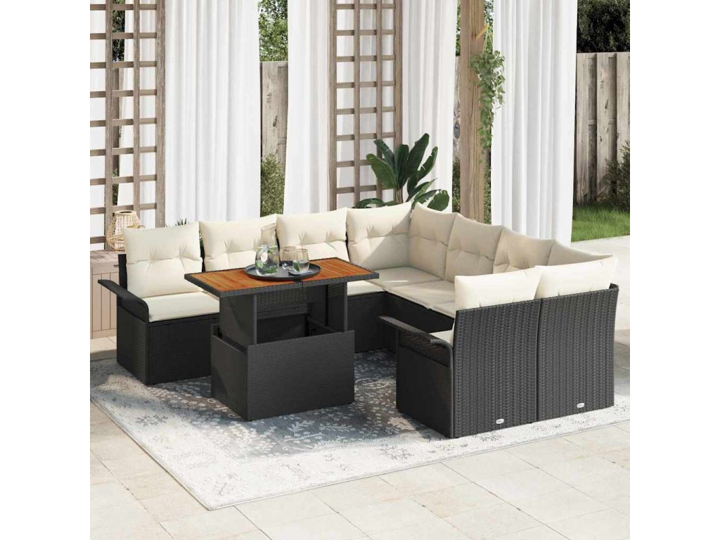 Tato devítikusová zahradní sada sedadel spojuje stylový design s pohodlím. Skvěle se hodí na každou terasu nebo zahradní prostor. Vyrobeno z pevného rámu přírodního ratanu s matným černým povrchem, dostaneš měkké polyesterové polštáře, které tě zvou k relaxaci, ať už pořádáš setkání nebo si prostě užíváš klidné odpoledne venku.