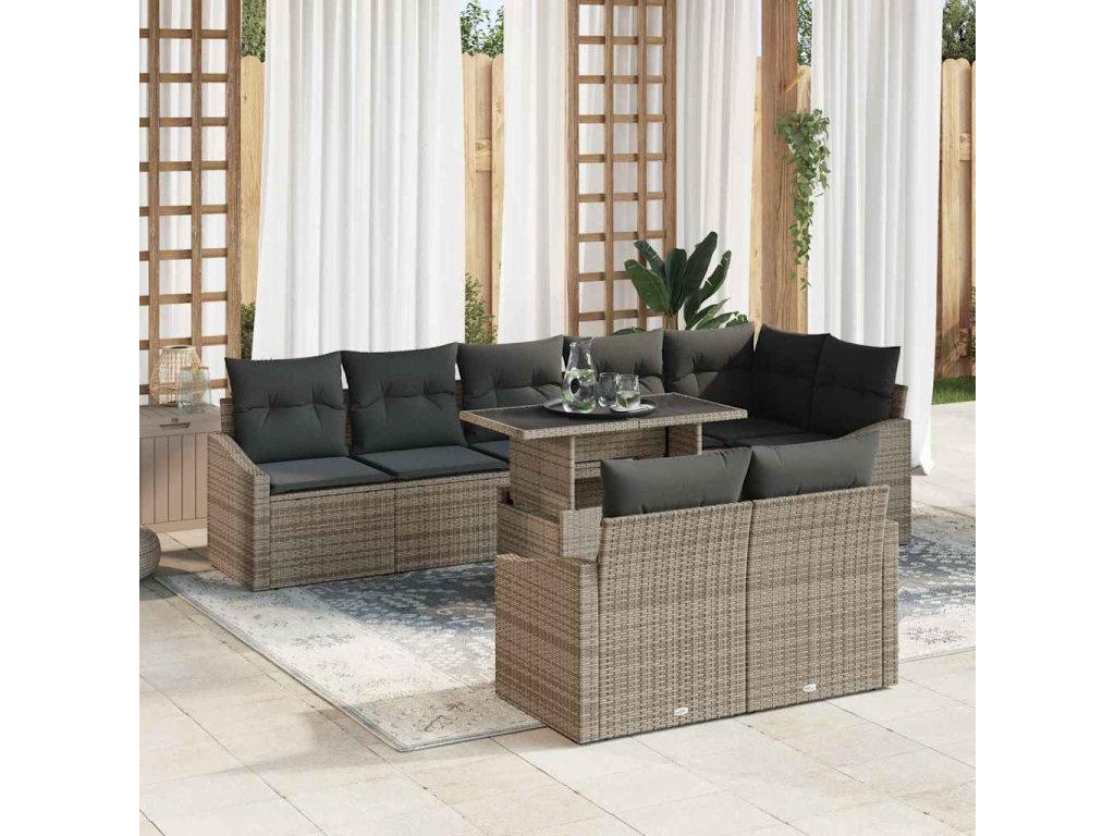 Tato devítidílná venkovní pohovka přináší styl a funkčnost na jakoukoli terasu nebo zahradu. Vyrobená z odolného ratanového příze a pevného rámu, má texturovaný povrch, co vypadá skvěle a zvládne počasí, což ji dělá ideální pro venkovní použití.
