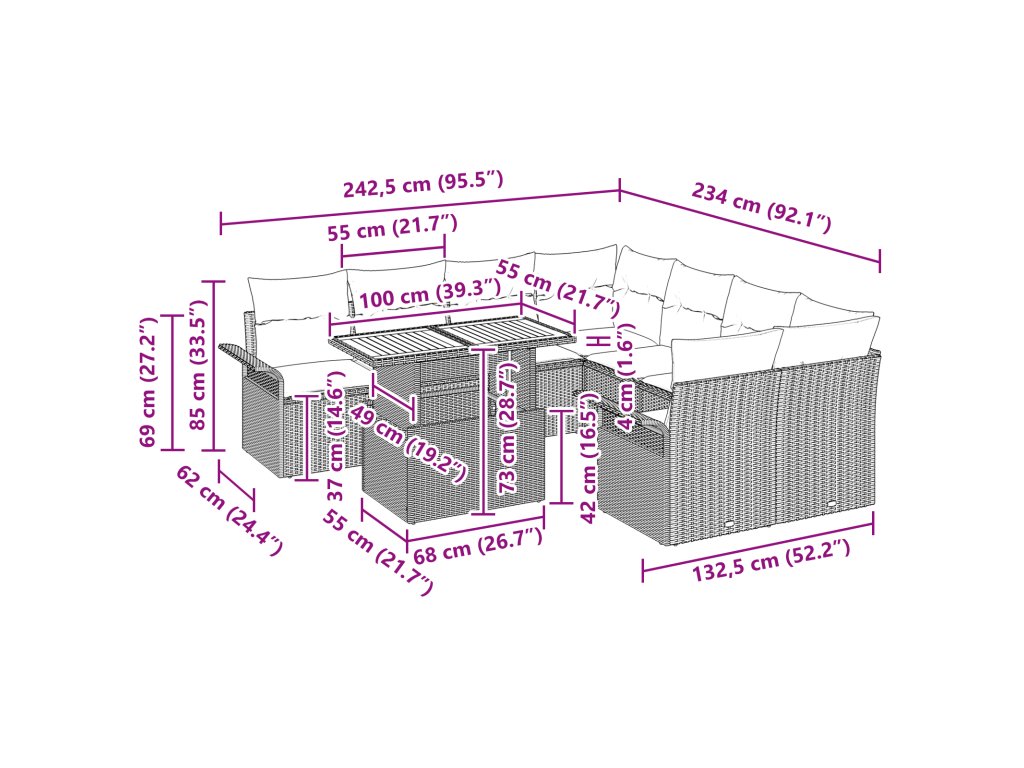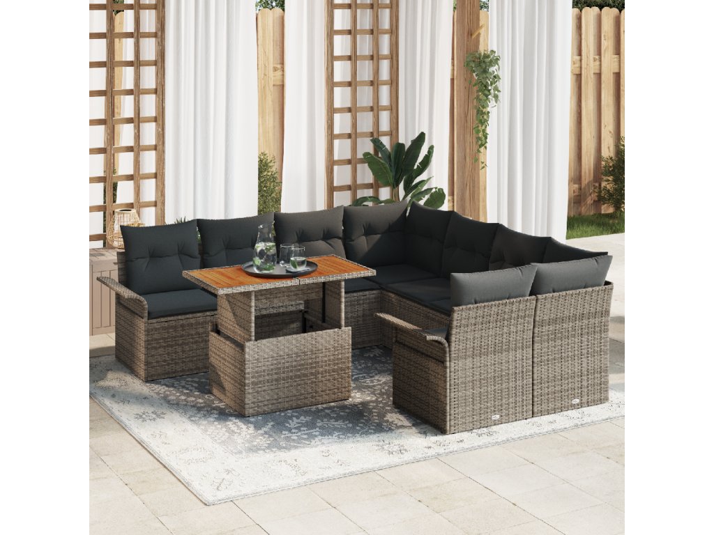 Tato 9-dílná zahradní sedačka má moderní a stylový design, který spojuje funkčnost s hezkým vzhledem, ideální pro oživení venkovních prostor. S dostatkem sedacích míst nenabízí tato sedačka pouze pohodlí, ale také přidává třídu vašemu balkonu nebo terase, což z ní dělá skvělé místo pro rodinu a přátele během krásných letních večerů.