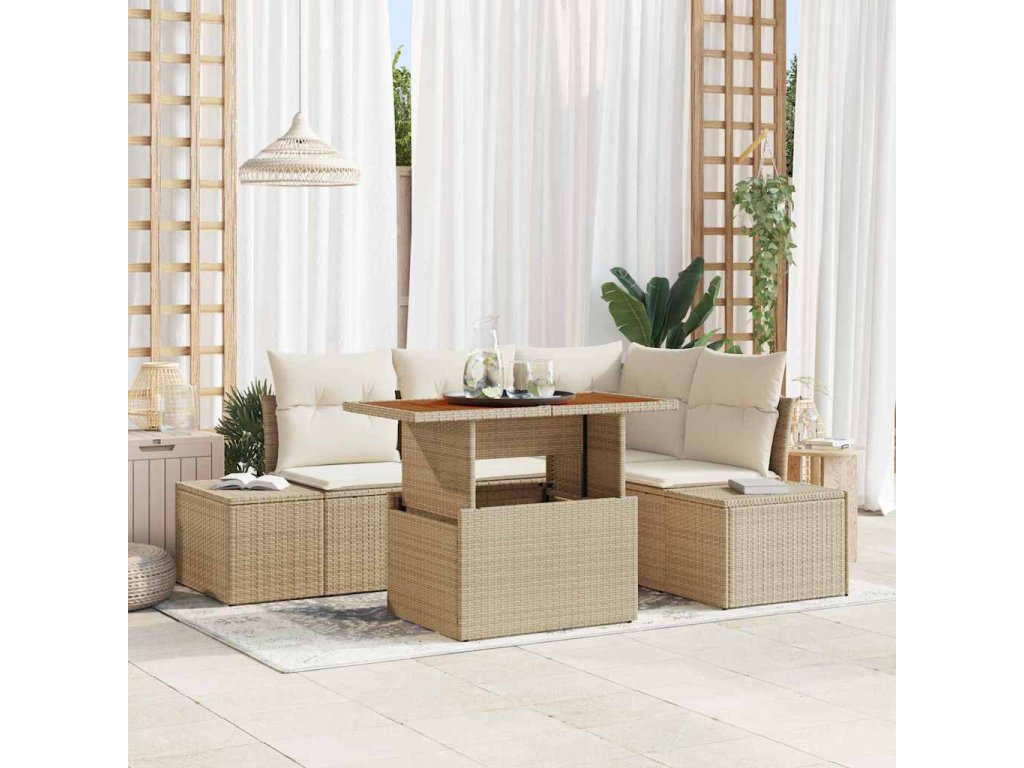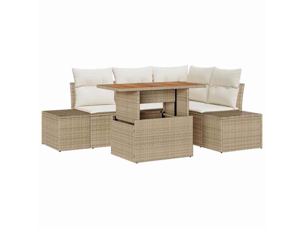 - 2 x Boční sofa včetně úložné funkce s vodotěsným vakem, 1 x Rohové sedadlo včetně úložné funkce s vodotěsným vakem, 1 x Centrální sedadlo včetně úložné funkce s vodotěsným vakem, 1 x Zahradní stůl