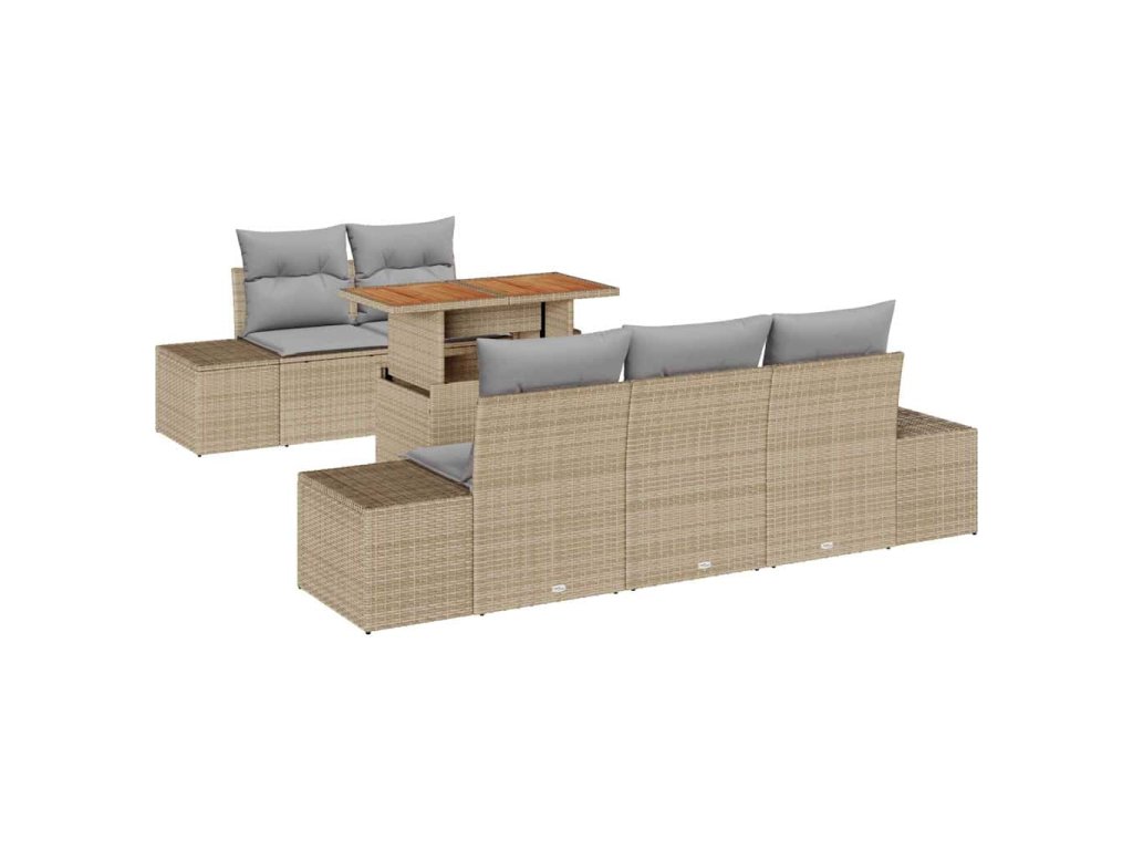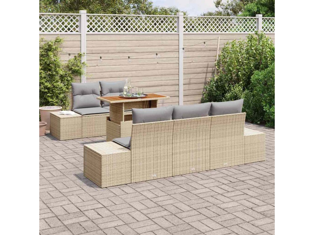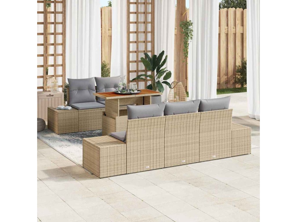 Tato sada zahradního sofa je stylová kombinace vzhledu a praktičnosti. Vyrobená z béžového poly ratanu a šedých polštářů, jasně oživí jakékoli venkovní místo, ať už je to terasa nebo balkon, pozve tě k odpočinku nebo setkání s kamarády.