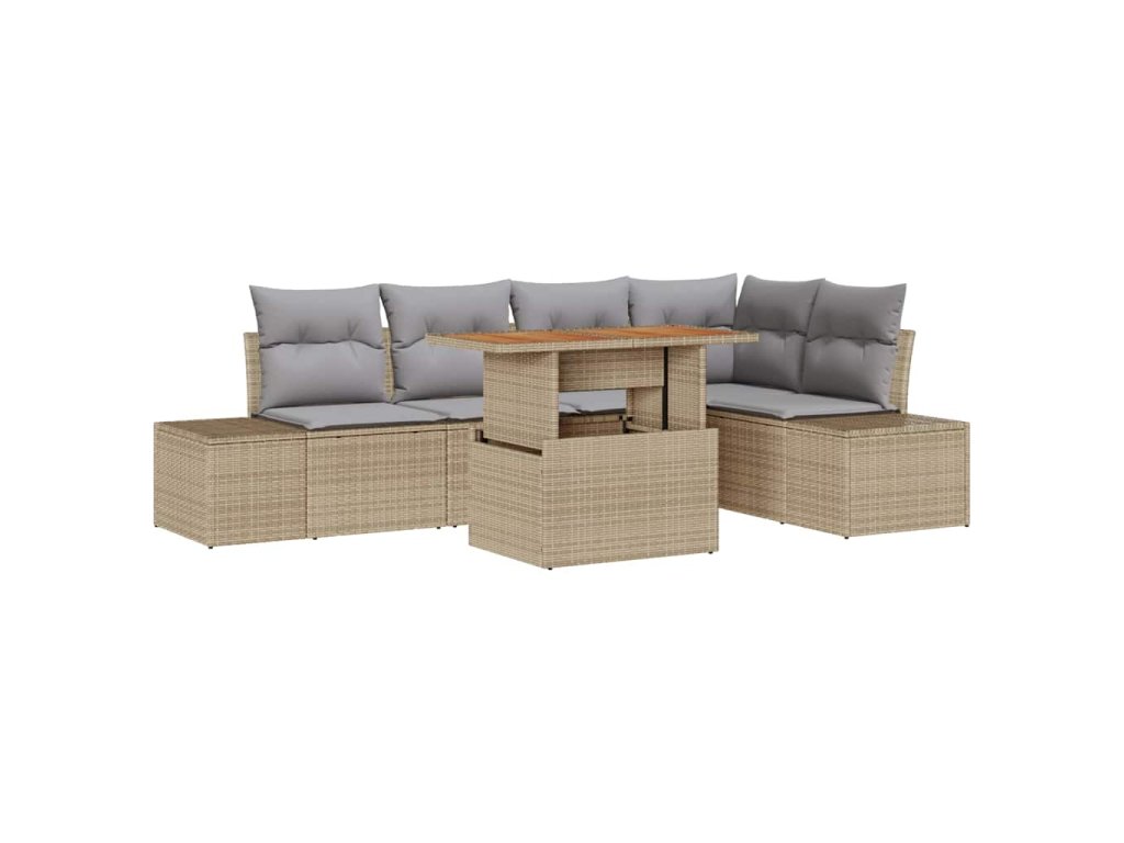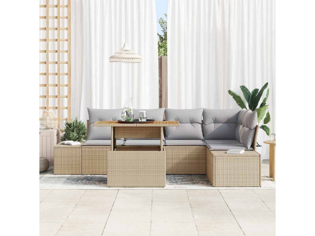 Tato 6-dílná zahradní sedací souprava je skvělá kombinace stylu a praktičnosti, ideální pro oživení vašich venkovních prostorů, jako jsou terasy a zahrady. Moderní design zahrnuje elegantní obdélníkový stůl a pohodlné polštáře, poskytující pohodlné sezení pro pět lidí a snadno umocňuje váš venkovní pocit.