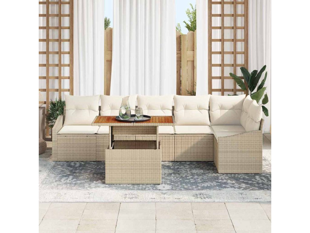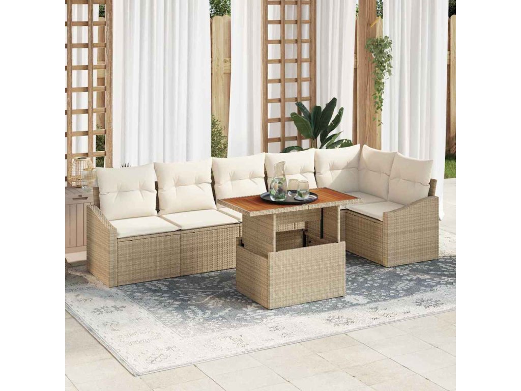 - 2 x Rukávová sedačka včetně úložné funkce s voděodolnou taškou, 1 x Rohové sedadlo včetně úložné funkce s voděodolnou taškou, 3 x Středové sedadlo včetně úložné funkce s voděodolnou taškou, 1 x Zahradní stůl
