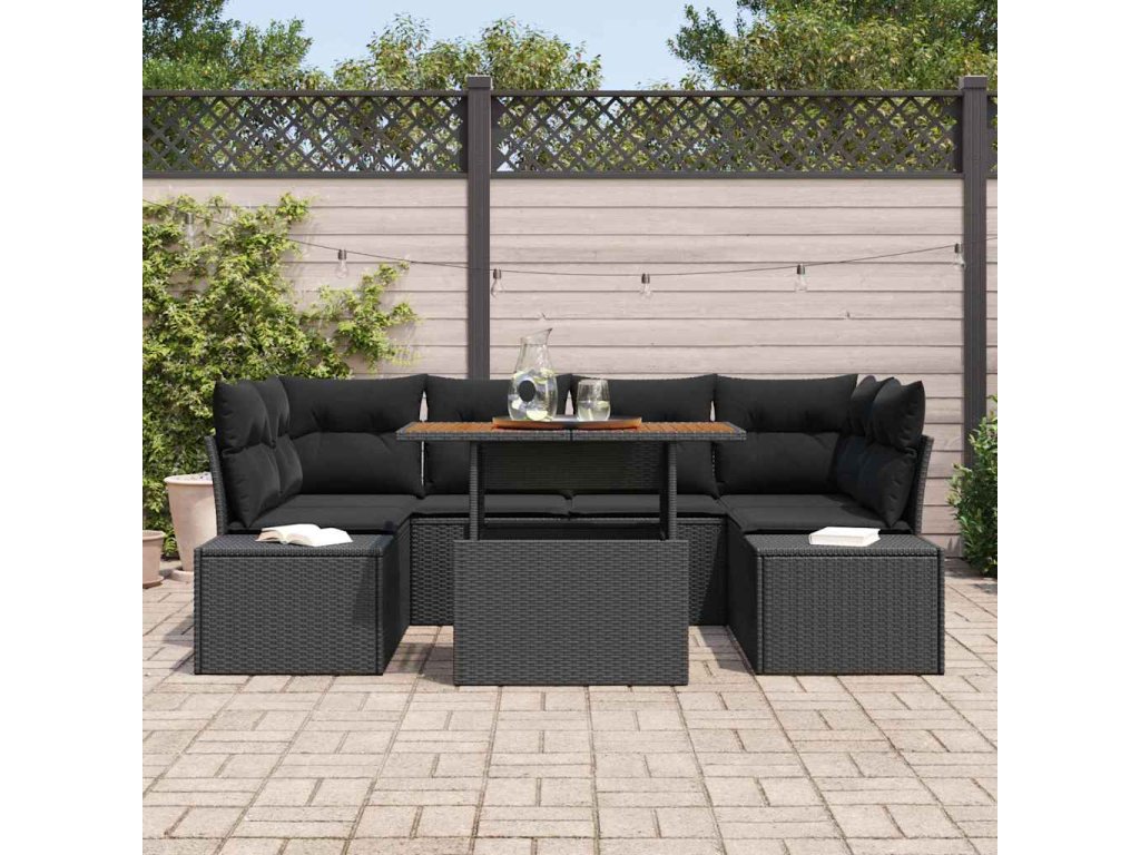 - Dodávka obsahuje: 2 x boční pohovka s úložištěm, 2 x rohové sedadlo s úložištěm, 2 x centrální sedadlo s úložištěm, 1 x zahradní stůl