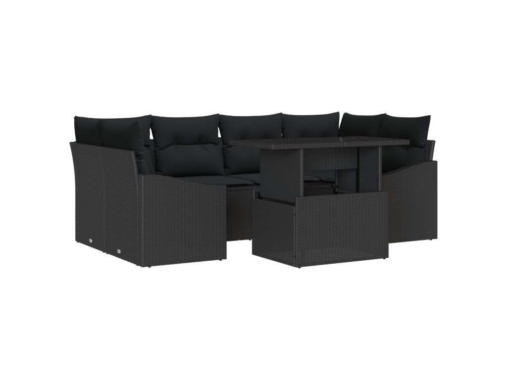 Tahle 7dílná venkovní pohovka promění vaši zahradu nebo terasu na stylové místo pro odpočinek, s dostatkem prostoru pro šest dospělých. Její elegantní černý syntetický ratanový design jí dodává moderní nádech, zatímco pohodlné polštáře ji dělají ideální pro shromáždění nebo relaxační večery venku.