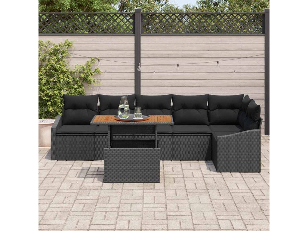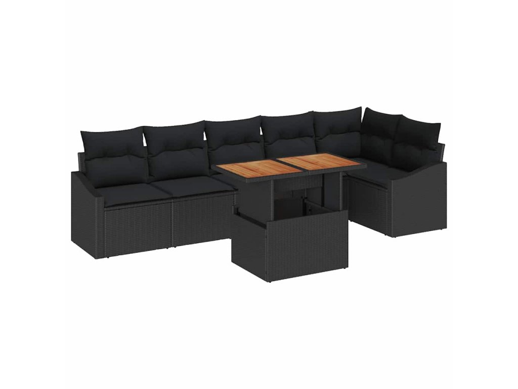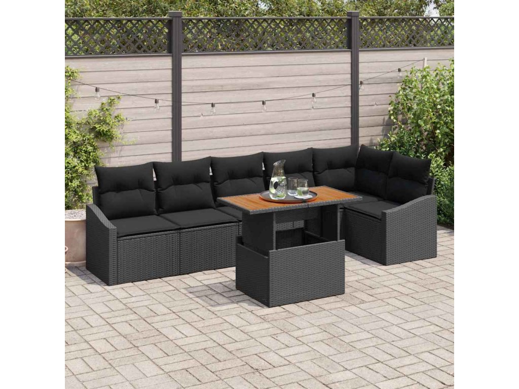 Tato 7-dílná zahradní sedací souprava od vidaXL spojuje praktičnost s moderním šarmem. Navržená aby oživila venkovní prostory jako balkony a terasy. Elegantní design kombinuje stylový poly ratan s přírodními dřevěnými detaily, což dělá pohodlné místo pro shromáždění, jídlo, nebo jen lenošení na sluníčku.