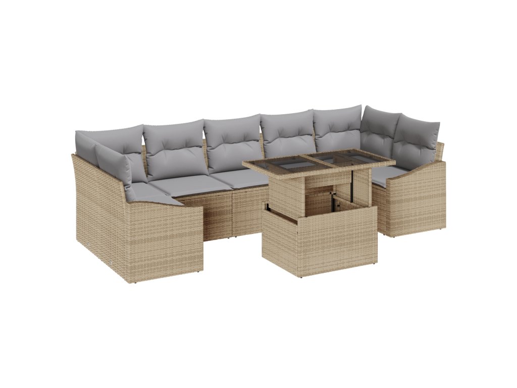 Tato 8dílná venkovní pohovková souprava je vyrobena z vysoce kvalitního syntetického ratanu a přichází s bohatými polštáři. Je to stylová součástka na jakékoliv setkání na tvém balkoně nebo zahradě. Elegantní béžová a šedá barva skvěle ladí s jakýmikoliv vnitřními nebo venkovními prostory.