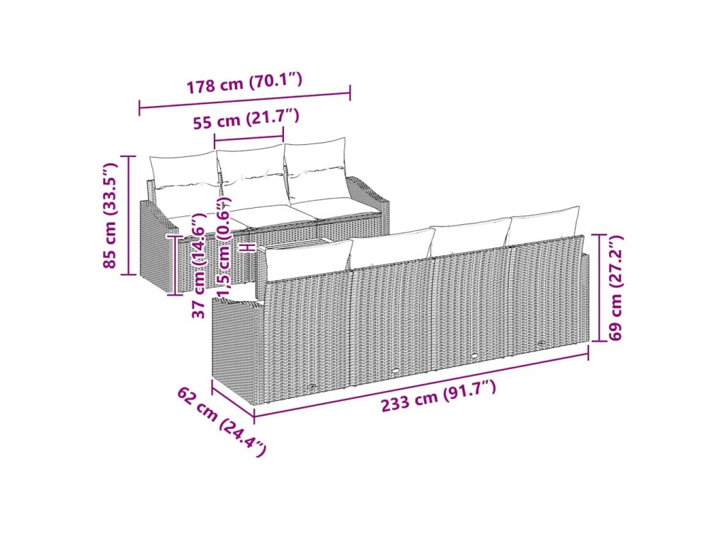 Tahle skvělá sada zahradního gauče z poly ratanu se zaměřuje na moderní design. Má styl a praktičnost v popředí. Elegantní linie a minimalistický vzhled vytvářejí stylový venkovní prostor, který je ideální pro odpočinek nebo zábavu. Čtvercové uspořádání se pohodlně vejde do jakékoli zahrady nebo na terasu, což z ní dělá perfektní místo pro jarní a letní akce.