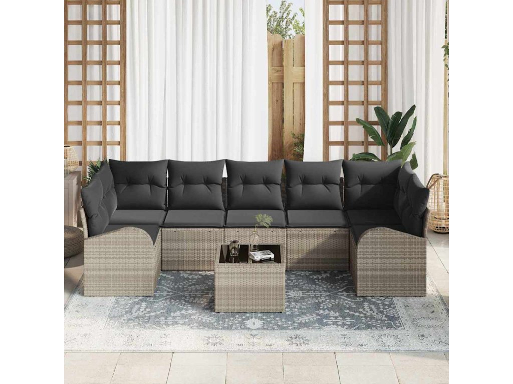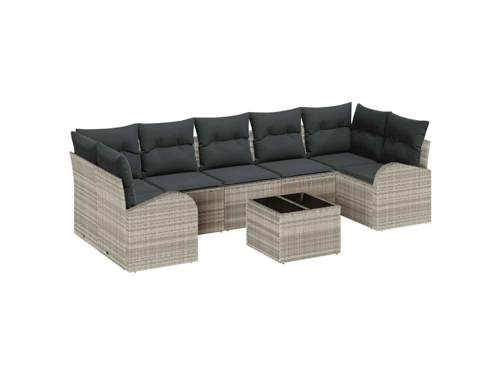 Tato 8-kusová sada zahradních pohovek s polštáři ve světle šedé kombinuje moderní styl a praktičnost, což ji dělá skvělou volbou pro venkovní setkání. Její svěží vzhled a měkké šedé polštáře jsou ideální na vychutnávání slunečních paprsků nebo pořádání setkání s přáteli a rodinou v zahradě.