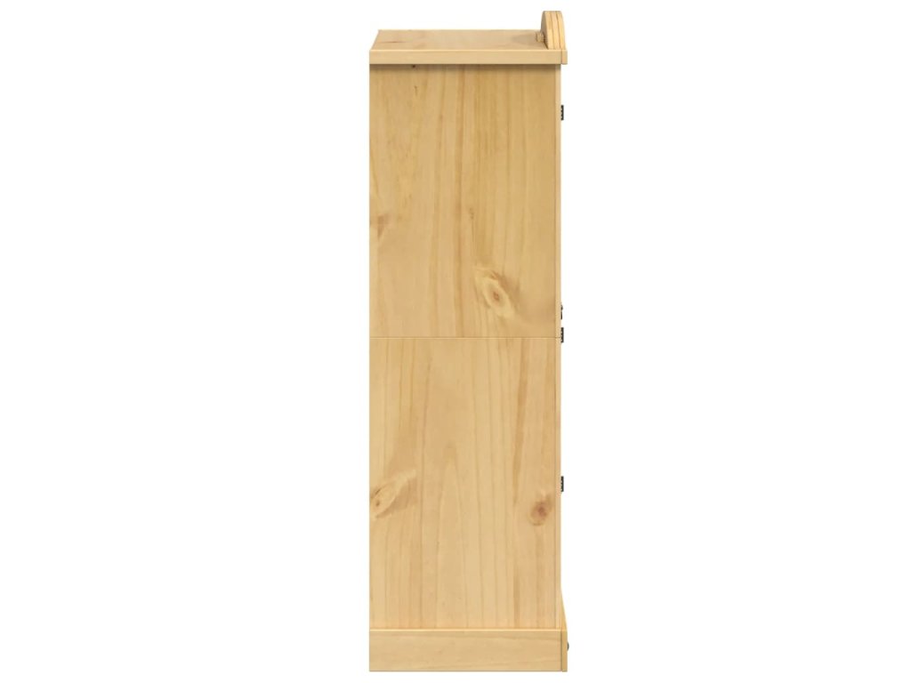 - Masivní borové dřevo: Masivní borové dřevo je krásný přírodní materiál. Borové dřevo má rovnou kresbu a obsahuje suky, které materiálu dodávají jeho charakteristický, rustikální vzhled. Skříňka je vyrobena z masivního borového dřeva a je odolná a robustní.