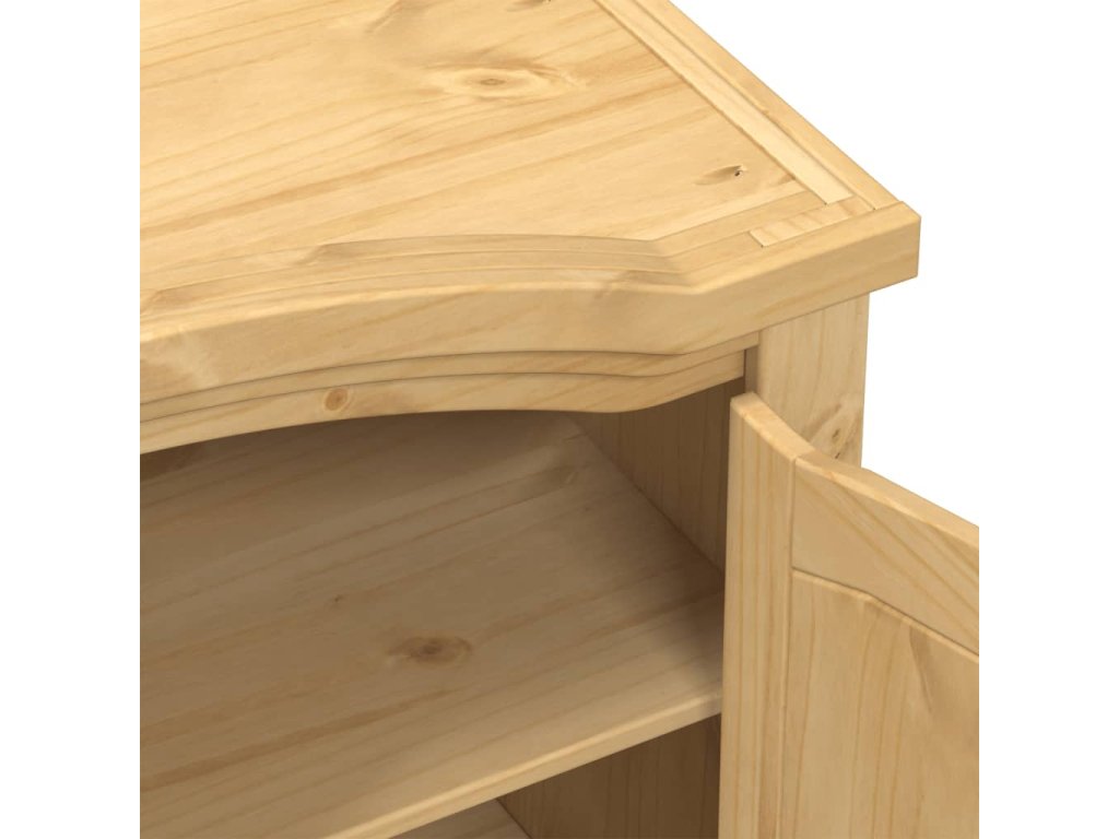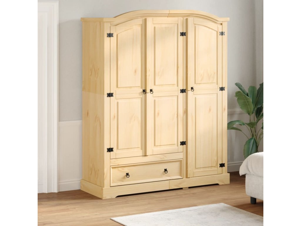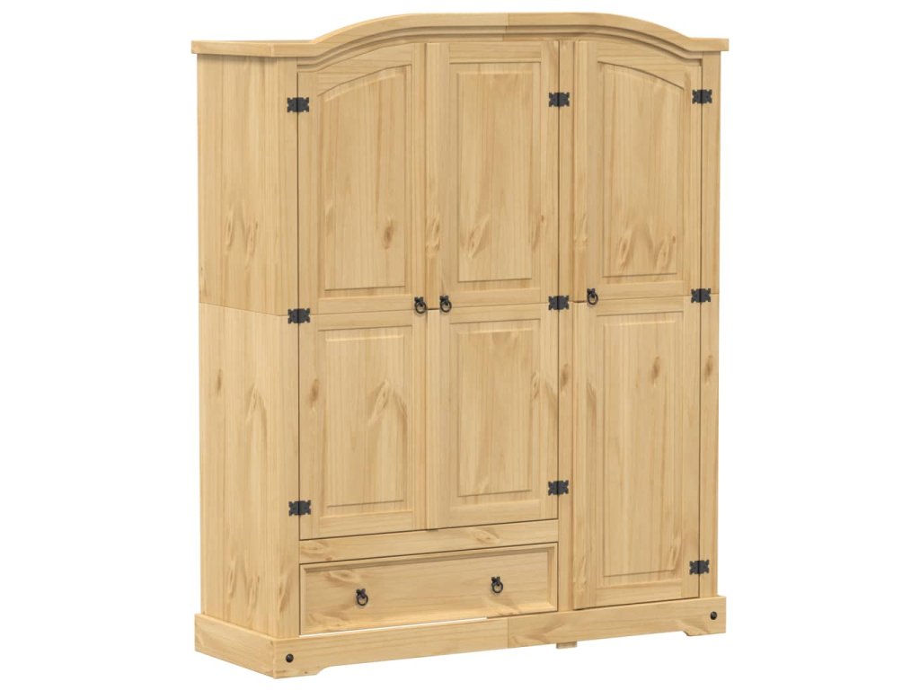 - Masivní borové dřevo: Masivní borové dřevo je krásný přírodní materiál. Borové dřevo má rovnou kresbu a obsahuje suky, které materiálu dodávají jeho charakteristický, rustikální vzhled. Skříňka je vyrobena z masivního borového dřeva a je odolná a robustní.