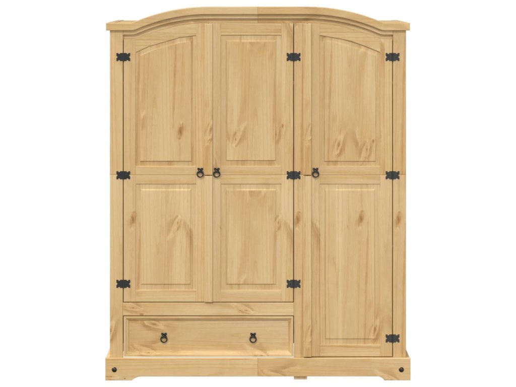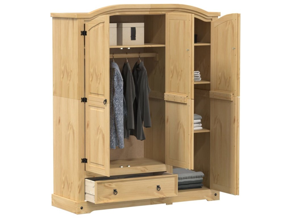 Tato klasická dřevěná šatní skříň nabízí dostatek úložného prostoru, abyste měli oblečení, boty a doplňky úhledně uspořádané.