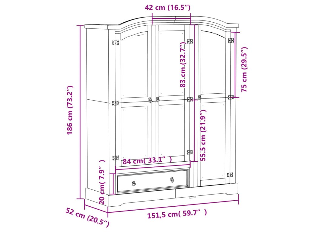 - Rozměry: 151,5 x 52 x 186 cm (Š x H x V)