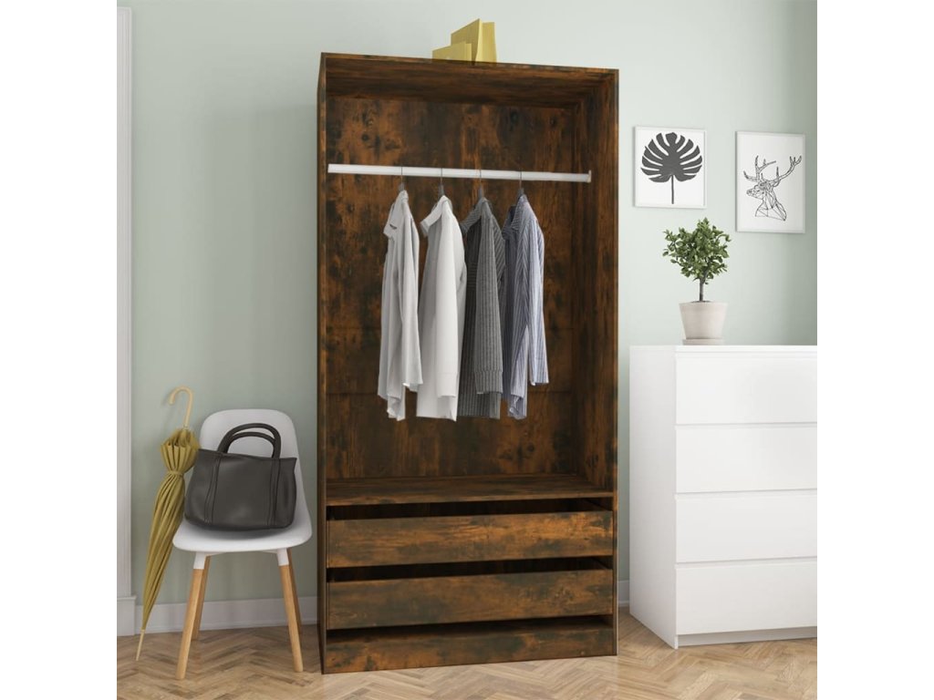 - Dostatek úložného prostoru: Skříň má dvě zásuvky a jednu velkou přihrádku s šatní tyčí. Najdete zde úložný prostor jak pro zavěšení delších oděvů, tak k uložení poskládaného oblečení, jako jsou svetry či džíny, a menších doplňků, například klobouků, kabelek atd.