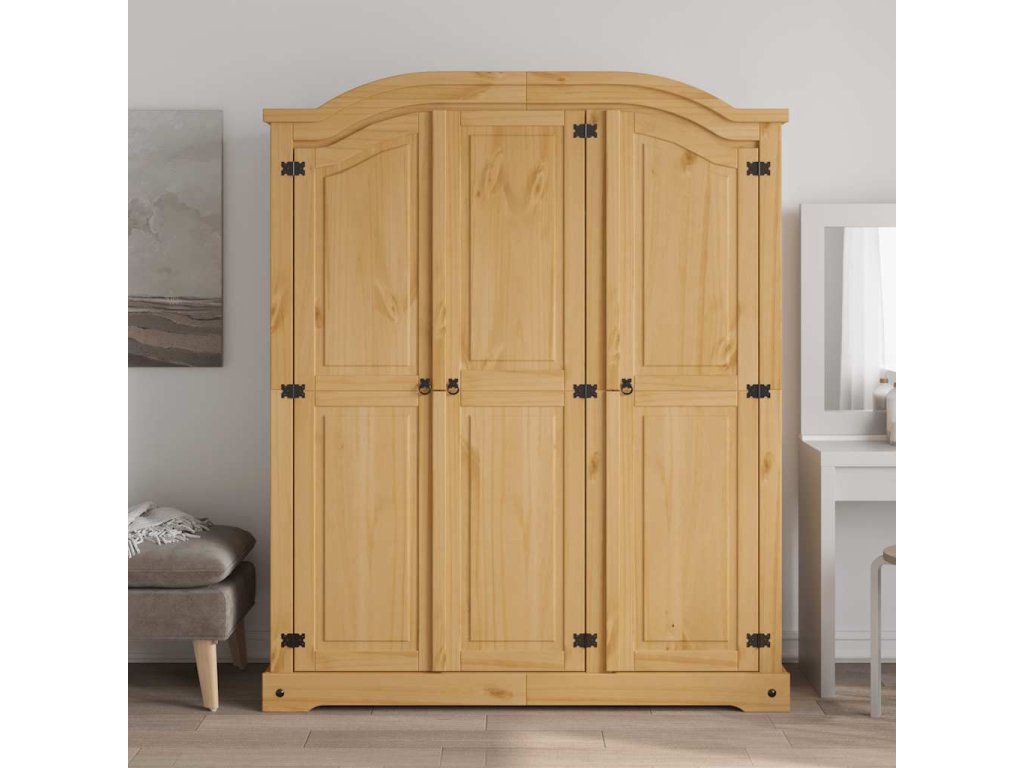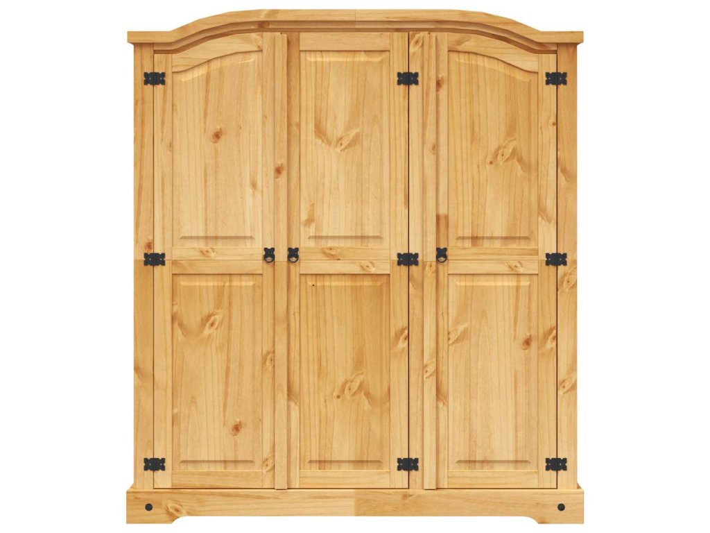 Šatní skříň má krásný klenutý design horní části a 3křídlé dveře. Pevná a bytelná skříň je zhotovená z masivního borového dřeva. V prostorné levé části je horní police a tyč na ramínka pro snadnou organizaci vašeho oblečení. V pravé části skříně jsou čtyři police, které jsou ideální pro vaše spodní prádlo, ponožky apod.