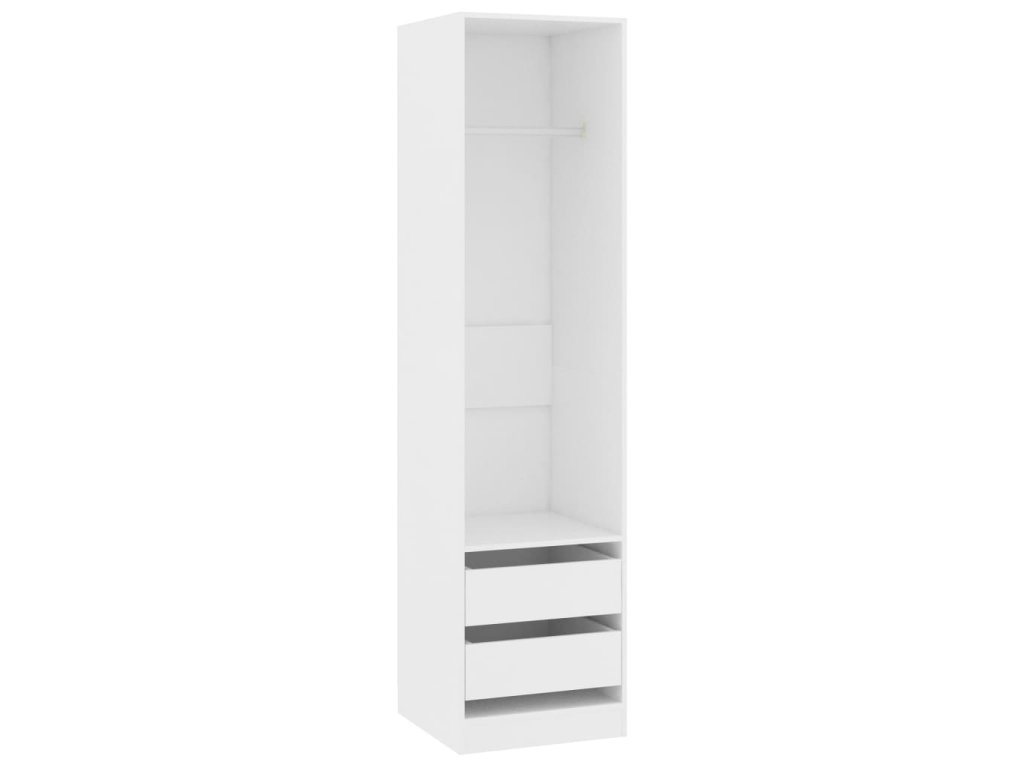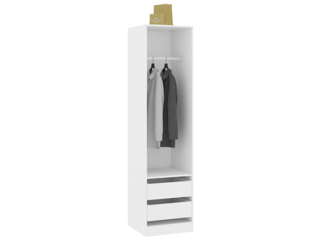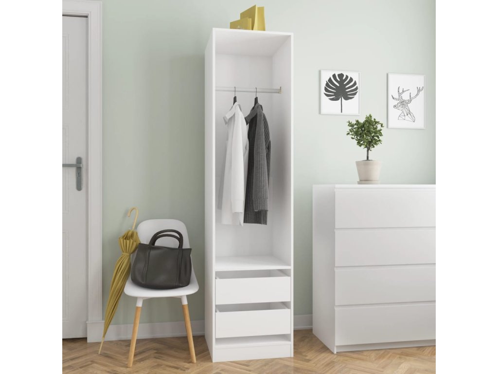 Šatník je vyrobený z desky, která je zárukou pevnosti, odolnosti a dlouhé životnosti. Uvnitř se nachází 2 zásuvky a 1 velká přihrádka s šatní tyčí. Najdete zde tudíž úložný prostor jak pro zavěšení delších oděvů, tak k uložení poskládaného oblečení, jako jsou svetry či džíny, a menších doplňků, například klobouků, kabelek atd.