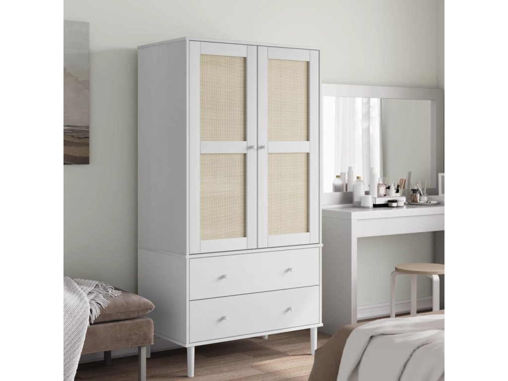 Tato klasická dřevěná šatní skříň nabízí dostatek úložného prostoru, abyste měli oblečení, boty a doplňky úhledně uspořádané.