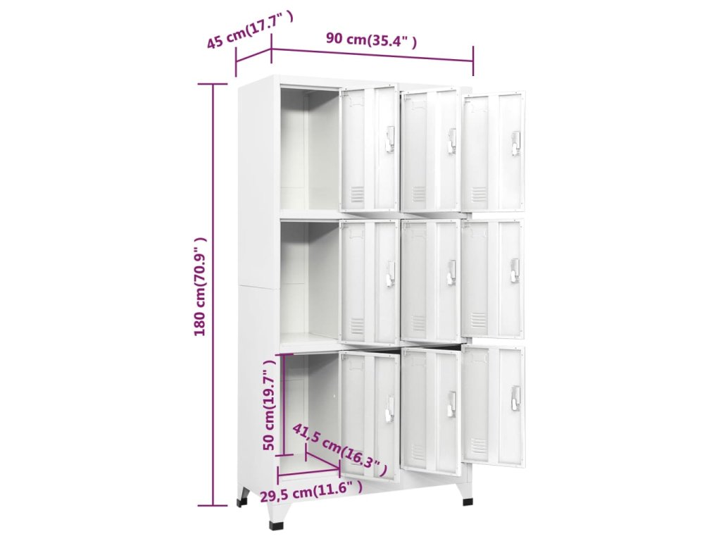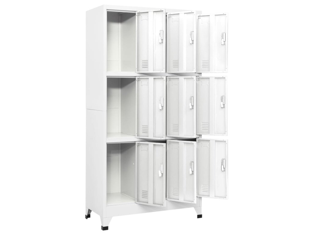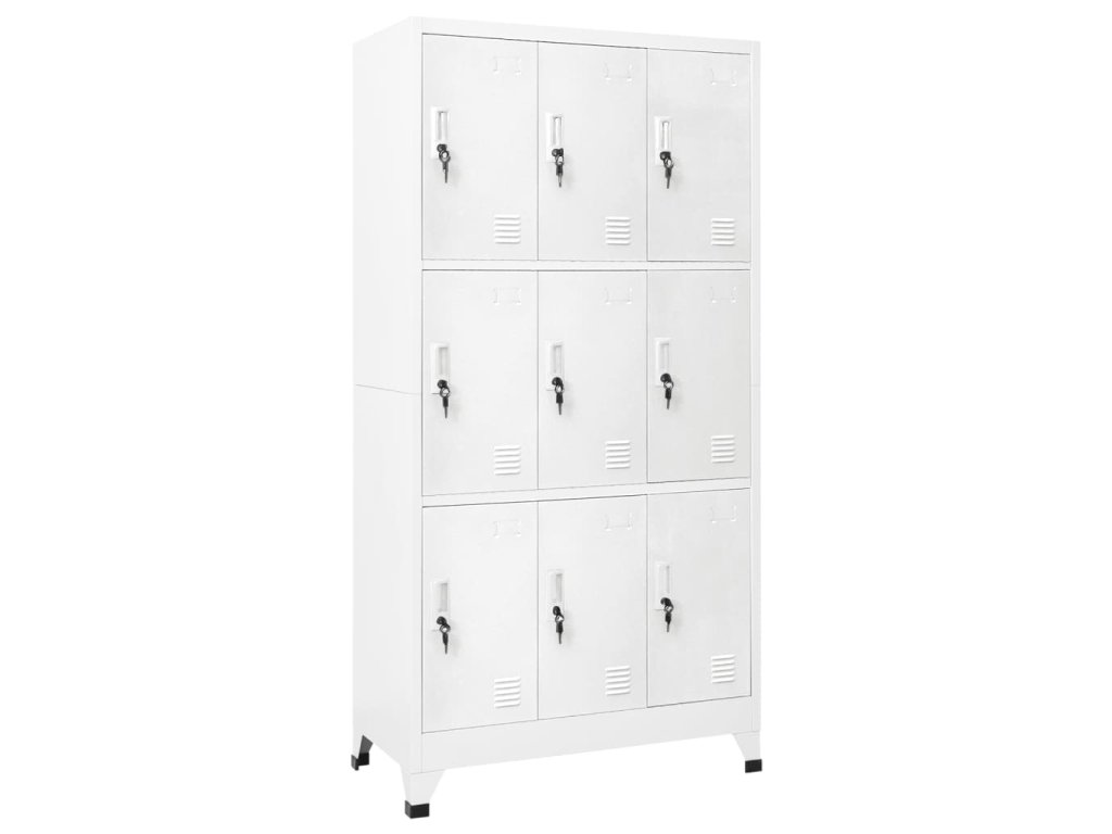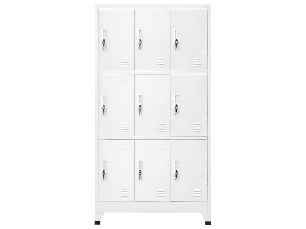 S 9 oddělenými přihrádkami s uzamykatelnými dveřmi má tato skříňka dostatek úložného prostoru pro uložení oblečení a dalších věcí. Každá přihrádka je vybavena držákem na jmenovku. Plastové nožičky zabraňují poškrábání podlahy.