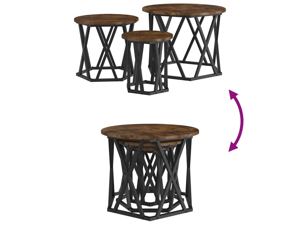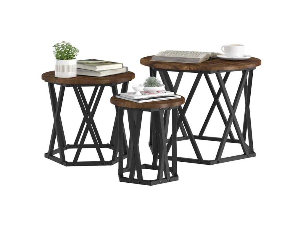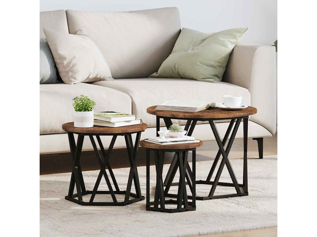 - Součásti: Sada obsahuje tři samostatné stolky, což ti dává spoustu možností, jak si uspořádat prostor. Každý má pevný černý ocelový rám, který poskytuje spolehlivou oporu, ať už je používáš samostatně, nebo dohromady.