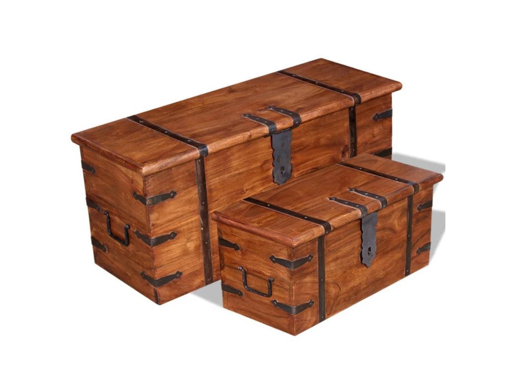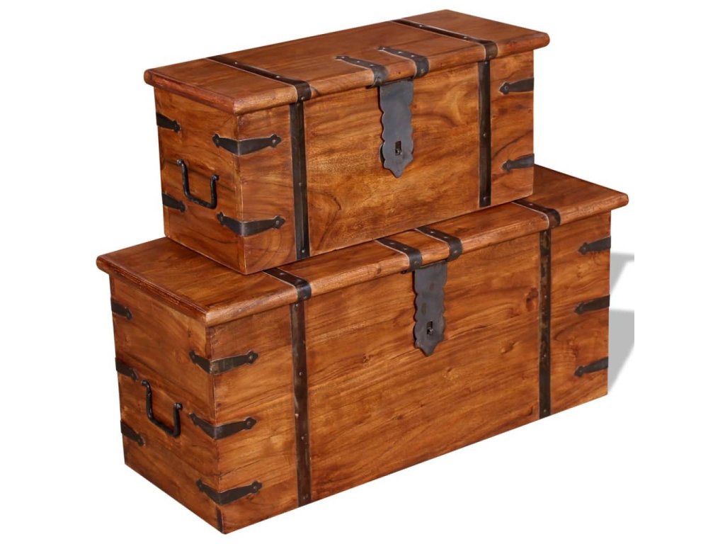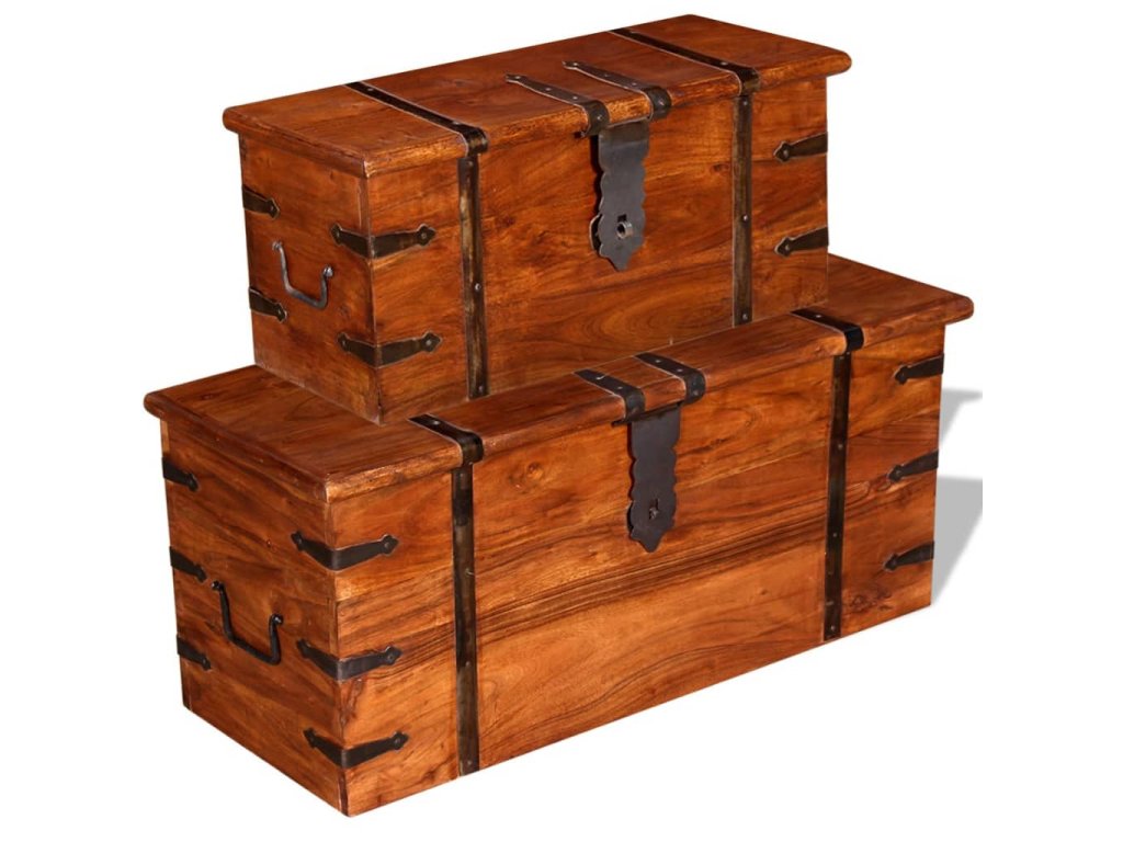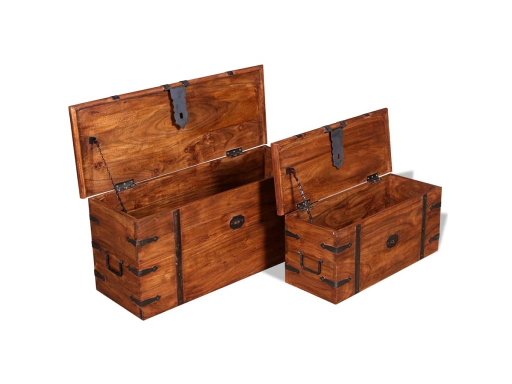 Tyto úložné boxy vnesou do vašeho bydlení dostatek úložného prostoru pro oblečení, časopisy, knihy, nářadí a další příslušenství. Na přední straně mají západku a dvě rukojeti po stranách. Jelikož mají pevnou horní desku, lze tyto dřevěné boxy použít také jako konferenční stolky, stolky ke gauči, stolky do obývacího pokoje, odkládací stolky, koncové stolky atd. Úložné truhly jsou ručně vyrobené z masivního akáciového dřeva a mají charakteristické vlastnosti palisandru a rosewood. Zručné řemeslné zpracování a krásná kresba dřeva propůjčuje každému kusu nábytku jeho jedinečný a od všech ostatních lehce odlišný vzhled.