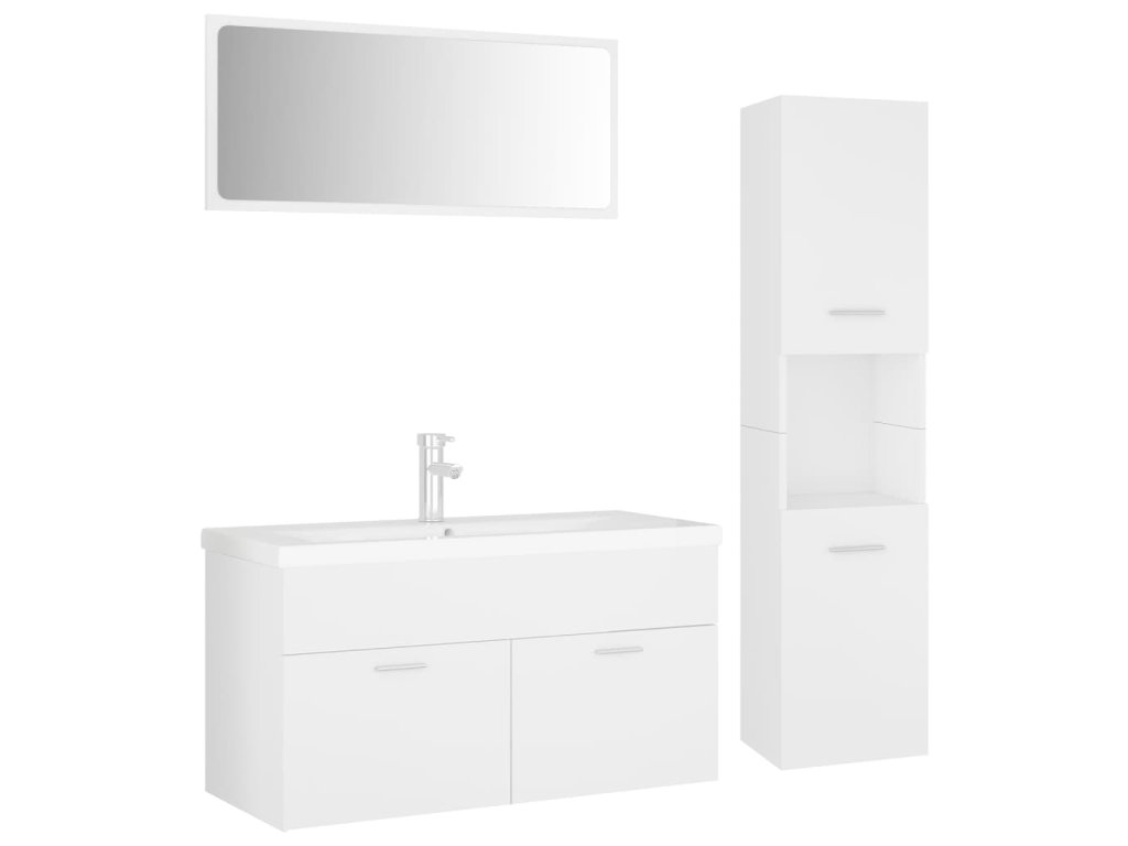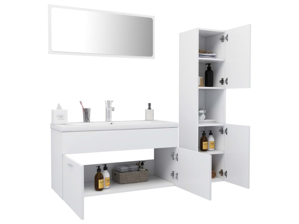 Set nábytku obsahuje skříňku pod umyvadlo, vysokou skříň, zápustné umyvadlo a zrcadlo. Stylová skříňka pod umyvadlo má 1 přihrádku a shora je ideálně uzpůsobená k umístění umyvadla. Ve vysoké skříni s dvojími dvířky najdete celkem 5 přihrádek a 2 dvířky, které vám poskytnou spoustu místa k uklizení vašich koupelnových potřeb. Keramické umyvadlo neslouží jen jako praktická nádoba pro každodenní použití – hraje také významnou dekorativní roli. Vzhledem k jeho trendovému a modernímu designu zaručeně zapadne do každého stylu zařízení. Součástí je i přepad, který umožňuje odtok vody, pokud se umyvadlo příliš přeplní. Zrcadlo vám rovněž pomůže zkrášlit vaše bydlení. Celou soupravu nábytku lze navíc snadno čistit navlhčeným hadříkem.