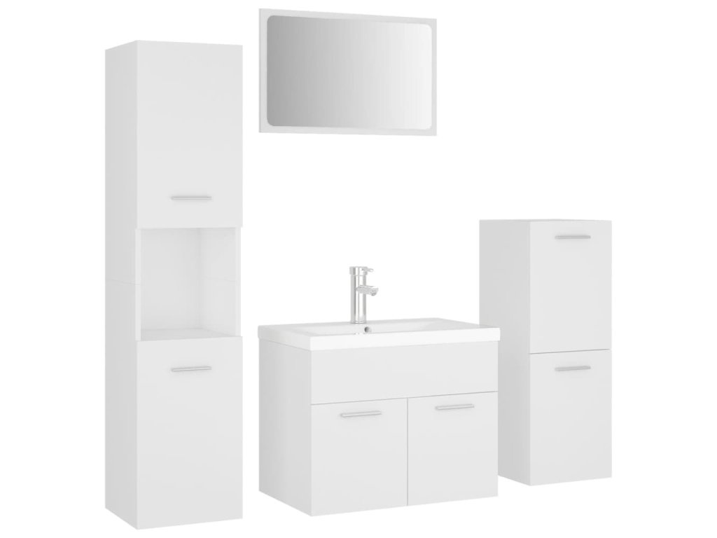 Set nábytku obsahuje skříňku pod umyvadlo, malou skříňku, vysokou skříň, zápustné umyvadlo a zrcadlo. Stylová skříňka pod umyvadlo má 1 přihrádku a shora je ideálně uzpůsobená k umístění umyvadla. Ve vysoké skříni s dvojími dvířky najdete celkem 5 přihrádek a 2 dvířky, v menší skříňce jsou další 2 přihrádky. Obě skříně vám nabídnou více místa a možností, kam si v koupelně uložit nejrůznější potřeby. Keramické umyvadlo neslouží jen jako praktická nádoba pro každodenní použití – hraje také významnou dekorativní roli. Vzhledem k jeho trendovému a modernímu designu zaručeně zapadne do každého stylu zařízení. Je vybavené také přepadem, který umožňuje odtok vody, pokud se umyvadlo příliš přeplní. Zrcadlo vám zase pomůže zkrášlit vaše bydlení. Celou soupravu nábytku lze navíc snadno čistit navlhčeným hadříkem.