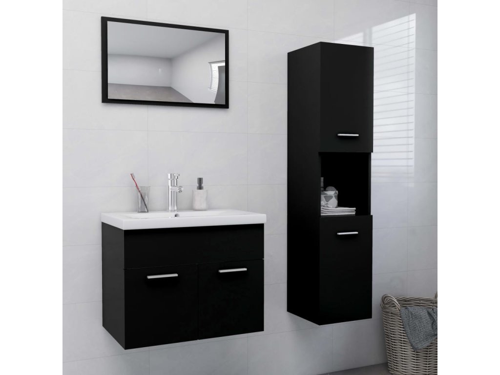 Sada nábytku obsahuje skříňku pod umyvadlo, vysokou skříň a zrcadlo. Stylová umyvadlová skříňka má 1 přihrádku a nahoře je ideálně uzpůsobená k umístění umyvadla. Ve vysoké skříni najdete za dvěma dvířky celkem 5 přihrádek, které vám poskytnou spoustu místa k uložení vašich věcí. Zrcadlo zase dodá vaší domácnosti nový půvab. Celý set koupelnového nábytku snadno očistíte navlhčeným hadříkem.