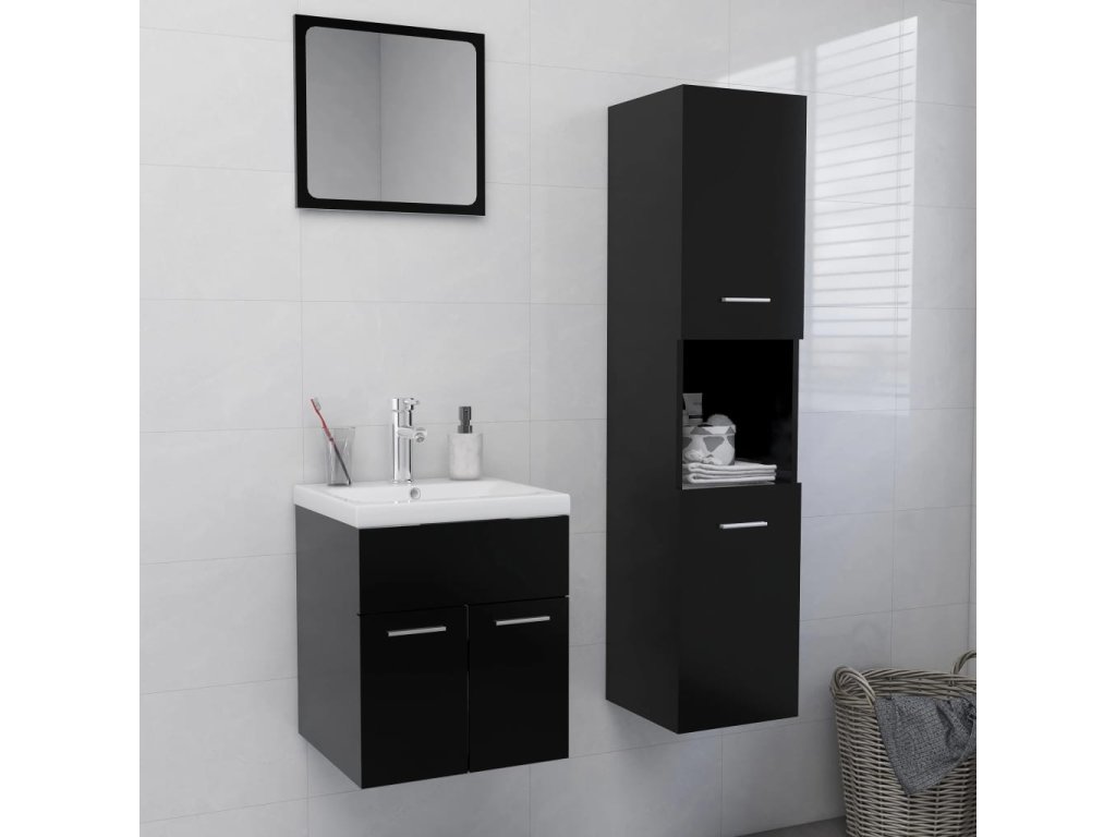 Sada nábytku obsahuje skříňku pod umyvadlo, vysokou skříň a zrcadlo. Stylová umyvadlová skříňka má 1 přihrádku a nahoře je ideálně uzpůsobená k umístění umyvadla. Ve vysoké skříni najdete za dvěma dvířky celkem 5 přihrádek, které vám poskytnou spoustu místa k uložení vašich věcí. Zrcadlo zase dodá vaší domácnosti nový půvab. Celý set koupelnového nábytku snadno očistíte navlhčeným hadříkem.