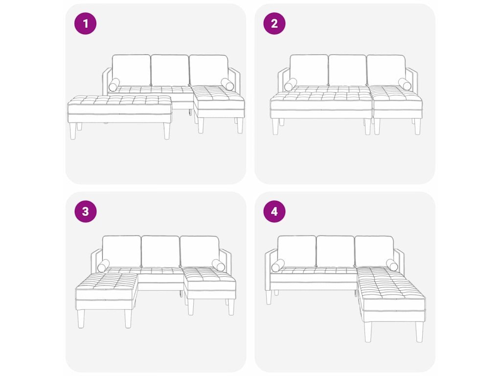 - Dodávka obsahuje: L-tvarovanou pohovku, lavici, polštářky
