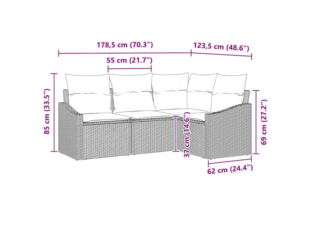 Tato venkovní modulární pohovková souprava je mix pohodlí a moderního stylu, ideální na každou terasu nebo zahradu. Má měkké šedé polštáře, které skvěle kontrastují s krásným béžovým ratanovým designem. Perfektní na balkony a terasy, tahle souprava vytváří teplé a přívětivé místo na vychutnávání slunce s přáteli.
