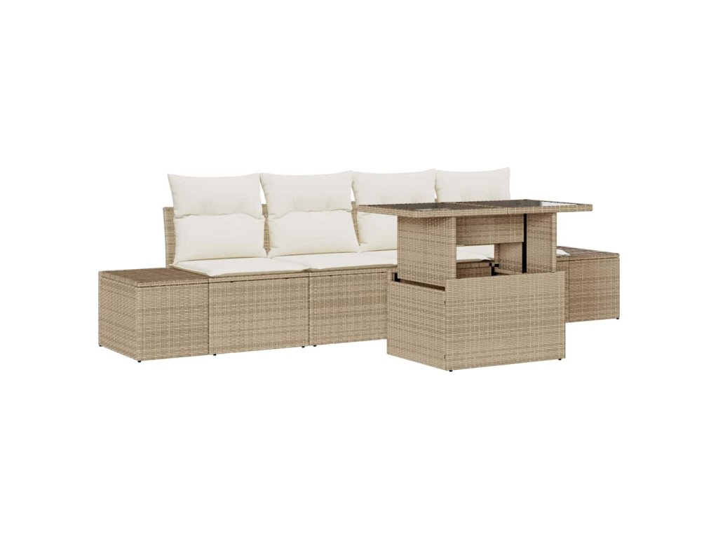 Tento 5dílný set zahradní pohovky spojil moderní design s praktickým využitím. Je vyroben z odolného poly ratanu a má krásné béžové a krémové barvy, které se hodí na venkovní setkání nebo k lenošení. Modulární styl vytváří příjemnou atmosféru, ideální pro relaxaci v odpoledních hodinách nebo živé večery s rodinou a přáteli.