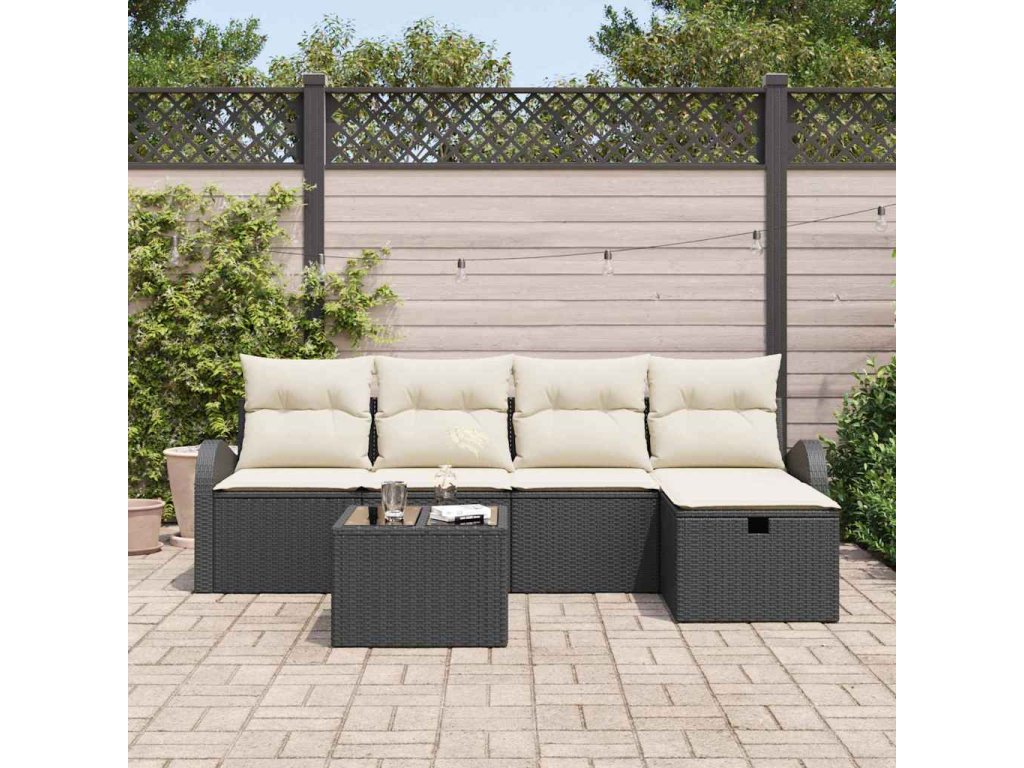 Tento zahradní pohovkový set je o odpočinku venku, s moderním černým poly ratanovým rámem a pohodlnými béžovými polštáři. Není to jen o vzhledu; vytváří útulnou atmosféru pro přátele a rodinu.