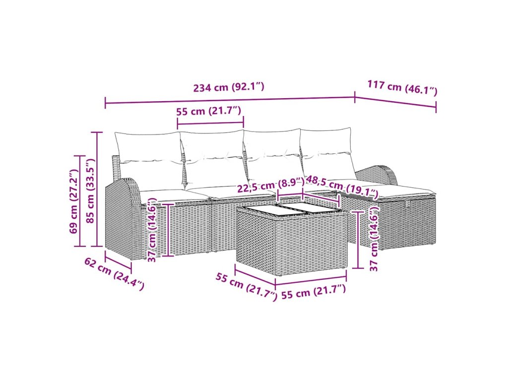 - Úložná funkcionalita: Každý kus má skryté úložiště pro polštáře nebo deky, když je nepotřebuješ. Udržuj svůj venkovní prostor v pořádku a zbav se nepořádku díky tomuto praktickému prvku.