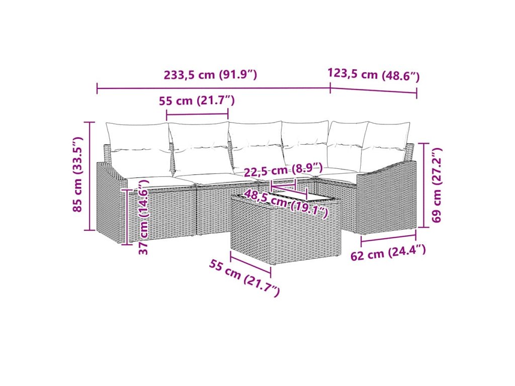 - Dodávka obsahuje: 1 x Rohové sedadlo, 2 x Centrální sedadlo, 2 x Rukávová pohovka, 1 x Stůl